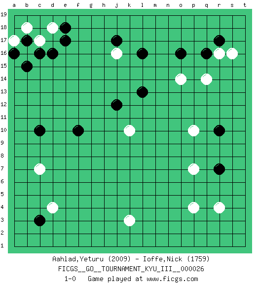 Last move : 1-0 2012 December 22 10:50:8 [Event "FICGS__GO__TOURNAMENT_KYU_III__000026"] [Site "FICGS"] [Date "2012.10.05"] [Round "1"] [Black "Aahlad,Yeturu"] [White "Ioffe,Nick"] [Result "1-0"] [Rating 1 "2009"] [Rating 2 "1759"] 1.q16 d4 2.c16 r4 3.e17 q14 4.o16 p4 5.c10 o14 6.l16 k3 7.r10 r16 8.r17 s16 9.l13 p10 10.r7 c7 11.f10 b16 12.b15 c17 13.d16 d18 14.e18 b18 15.a16 a17 16.b17 k10 17.j12 j16 18.j17 p7 19.c3 1-0 This go game has been lost on time (started : 2012.10.05 16:27:36) Here are the names of the openings (joseki) played in the four corners : Corner q16 : q16 q14 Hoshi (Hwajeom, Seongjeom, Xingwei`) 4-4 Point. The star or hoshi (4-4) point, emphasizing influence at the potential expense of territory. Ikken Takagakari (Hankan Nop'dakeolch'im, Yi Gaojia, 1-Space High Approach). Black typically responds at 6-4 or 3-10. Black 4-10 is played when Black finds play on the right side advantageous. Black 4-8 or 3-8 may be played when Black has support at top. Player Black won this Go (weiqi, baduk) game. Follow this game move after move (download)Proverbs do not apply to White. (Tero Sand) Knowledge will give you power, but character respect. (Bruce Lee)