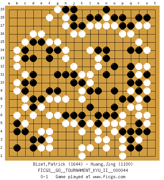 Last move : 0-1 2013 May 25 20:52:1 [Event "FICGS__GO__TOURNAMENT_KYU_II__000044"] [Site "FICGS"] [Date "2012.10.06"] [Round "1"] [Black "Bizet,Patrick"] [White "Huang,Jing"] [Result "0-1"] [Rating 1 "1644"] [Rating 2 "1100"] 1.q4 e16 2.c4 r15 3.q17 p16 4.o18 n17 5.m18 n18 6.n19 m17 7.l18 l17 8.k17 k16 9.j17 j16 10.q12 r17 11.r18 s17 12.s18 q16 13.p17 o17 14.p18 q9 15.o12 m12 16.n11 l10 17.o9 r6 18.o7 p6 19.o6 p5 20.p4 o5 21.q8 r8 22.r9 q7 23.p8 s9 24.r10 s10 25.s8 r7 26.s11 r11 27.q10 s12 28.q11 r12 29.s4 o4 30.o3 n3 31.o2 m4 32.d13 c15 33.d10 e4 34.e3 f3 35.d3 f4 36.l1 k2 37.l7 c5 38.b4 c8 39.c9 b13 40.c13 b12 41.f13 h13 42.d8 c7 43.g11 h17 44.j18 h18 45.h19 g19 46.j19 f18 47.n13 m13 48.n14 f8 49.f9 g8 50.k6 j5 51.j6 h5 52.d7 d6 53.d15 d16 54.e15 f15 55.f14 g15 56.m14 l14 57.h11 j12 58.j11 k11 59.m9 e2 60.d2 f2 61.b5 b6 62.b2 e7 63.e8 f6 64.g9 h8 65.k5 k4 66.q14 s5 67.r5 s6 68.c14 b14 69.m5 n5 70.n6 l5 71.m6 l2 72.m2 n2 73.n1 m3 74.m1 k1 75.o1 r3 76.r4 p3 77.q3 p2 78.q2 p1 79.r2 c11 80.d11 b9 81.c10 b10 82.r14 s14 83.k10 k9 84.j10 l11 85.l9 k8 86.g14 h14 87.h6 g6 0-1 Here are the names of the openings (joseki) played in the four corners : Corner q16 : r15 q17 Mokuhazushi (Waemok, Wai`mu`) 5-3 Point. The mokuhazushi (5-3) point was popular in the Edo period in Japan (1600 - 1867). It emphasizes influence; territorially, it is inferior to the 3-4 point. Komoku Kakari. Black 2 is the standard approach because of its solidity and stability. Corner d16 : e16 j17 Takamoku (Gomok, Gaomu`) 5-4 Point. The takamoku (high) point (5-4). With its emphasis on influence, the 5-4 point complements the 4-4 (hoshi) point in creating an influence-oriented fuseki. Corner q4 : q4 q9 Hoshi (Hwajeom, Seongjeom, Xingwei`) 4-4 Point. The star or hoshi (4-4) point, emphasizing influence at the potential expense of territory. Corner d4 : c4 e4 Komoku (Somok, Xiao~mu`) 3-4 Point. The komoku (3-4) point is the traditional corner enclosure move.. Ikken Takagakari (Hankan Nop'dakeolch'im, Yi Gaogua`jiao~, 1-Space High Approach). The 5-4 approach move has become more popular in modern times, as modern Go emphasizes speed and influence. Player White won this Go (weiqi, baduk) game. Follow this game move after move (download)Beware of the clumsy double contact. (Anonymous) Cactus - It is depressed cucumber. (Ilmars Cirulis)