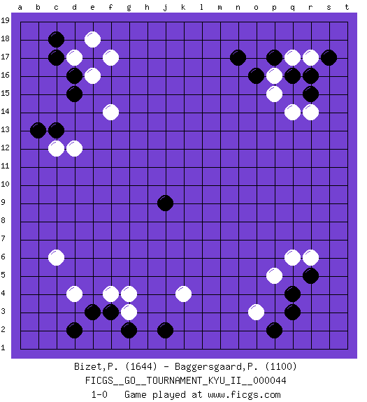 Last move : 1-0 2013 January 11 0:9:5 [Event "FICGS__GO__TOURNAMENT_KYU_II__000044 "] [Site "FICGS"] [Date "2012.10.06"] [Round "1"] [Black "Bizet,Patrick "] [White "Baggersgaard,Poulerik "] [Result "1-0"] [Rating 1 "1644"] [Rating 2 "1100"] 1.q4 d17 2.q16 d4 3.f3 c6 4.d2 g3 5.g2 f4 6.e3 g4 7.j2 k4 8.d15 d12 9.e17 e16 10.d16 f17 11.c17 e18 12.c18 f14 13.c13 c12 14.b13 r6 15.j9 o3 16.r5 q6 17.q3 p5 18.p2 r14 19.r15 q14 20.n17 r17 21.r16 q17 22.p17 p16 23.o16 p15 24.s17 1-0 This go game has been lost on time (started : 2012.10.06 9:35:44) Here are the names of the openings (joseki) played in the four corners : Corner d4 : d4 f3Hoshi (Hwajeom, Seongjeom, Xingwei`) 4-4 Point. The star or hoshi (4-4) point, emphasizing influence at the potential expense of territory.Ikken Kakari (Hankan Keolch'im, Yi Gua`jiao~, 1-Space Low Approach). Black 2 is the standard approach move to the 4-4. Corner d16 : d17 d15Komoku (Somok, Xiao~mu`) 3-4 Point. The komoku (3-4) point is the traditional corner enclosure move..Ikken Takagakari (Hankan Nop'dakeolch'im, Yi Gaogua`jiao~, 1-Space High Approach). The 5-4 approach move has become more popular in modern times, as modern Go emphasizes speed and influence. Corner q4 : q4 r6Hoshi (Hwajeom, Seongjeom, Xingwei`) 4-4 Point. The star or hoshi (4-4) point, emphasizing influence at the potential expense of territory.Ikken Kakari (Hankan Keolch'im, Yi Gua`jiao~, 1-Space Low Approach). White 2 is the standard approach move to the 4-4. Corner q16 : q16 r14Hoshi (Hwajeom, Seongjeom, Xingwei`) 4-4 Point. The star or hoshi (4-4) point, emphasizing influence at the potential expense of territory.Ikken Kakari (Hankan Keolch'im, Yi Gua`jiao~, 1-Space Low Approach). White 2 is the standard approach move to the 4-4. Player Black won this Go (weiqi, baduk) game.Follow this game move after move (download ) When in doubt, remove the enemy stones from the board. (Bill Taylor) The real voyage of discovery consists not in seeking new lands but in seeing with new eyes. (Marcel Proust)