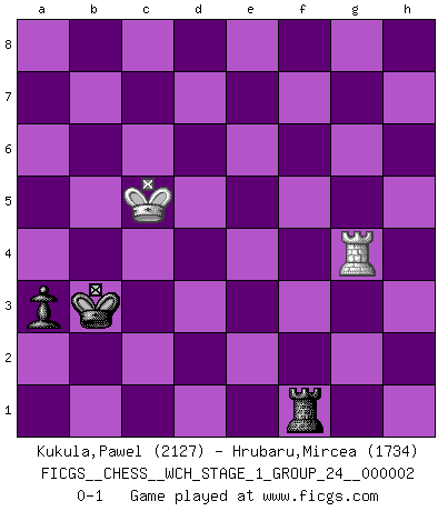 Last move : 0-1 2007 July 19 23:3:1 [Event "FICGS__CHESS__WCH_STAGE_1_GROUP_24__000002"] [Site "FICGS"] [Date "2007.01.16"] [Round "1"] [White "Kukula,Pawel"] [Black "Hrubaru,Mircea"] [Result "0-1"] [WhiteElo "2127"] [BlackElo "1734"] 1.e4 e5 2.Nc3 Nf6 3.f4 d5 4.fxe5 Nxe4 5.Nf3 Bc5 6.d4 Bb4 7.Bd2 c5 8.dxc5 Bxc3 9.Bxc3 Nxc3 10.bxc3 Qa5 11.Qxd5 Qxc3+ 12.Kf2 Nc6 13.Bd3 Be6 14.Qe4 O-O-O 15.Rhe1 Qxc5+ 16.Qe3 Qxe3+ 17.Kxe3 Rd5 18.Be4 Rc5 19.Kf4 Rd8 20.h4 Bd5 21.Bxh7 g6 22.h5 Rc4+ 23.Kg3 Rh8 24.hxg6 fxg6 25.Rh1 Rc3 26.Kf4 Rf8+ 27.Kg5 Bxf3 28.gxf3 Nxe5 29.f4 Rf5+ 30.Kh6 Rxf4 31.Rae1 Rc5 32.Bg8 g5 33.Bb3 Kc7 34.Rh5 Rf5 35.Kg7 Rc6 36.Rg1 Nf3 37.Rg4 a5 38.c3 Kb8 39.Rh8+ Ka7 40.Rf8 Rc7+ 41.Kg8 R7c5 42.Rg3 Rxf8+ 43.Kxf8 Nd2 44.Bc2 b5 45.Bg6 Kb6 46.Kg7 Re5 47.Bd3 Rd5 48.Kf6 g4 49.Bf5 Nf1 50.Rg1 Ne3 51.Bxg4 Nxg4+ 52.Rxg4 Rd2 53.a4 Rc2 54.axb5 Rxc3 55.Rg8 Rc5 56.Ke6 Kxb5 57.Kd6 Kb4 58.Rb8+ Rb5 59.Rg8 Rf5 60.Rb8+ Ka3 61.Rg8 a4 62.Kc6 Rf3 63.Rb8 Ka2 64.Kc5 Rf4 65.Rg8 a3 66.Rg3 Kb2 67.Rg2+ Kb3 68.Rg3+ Ka4 69.Rg2 Rf1 70.Rg4+ Kb3 0-1 Vienna gambit Queenside Castling by player Black (move 14) 10 pieces endgame at move 51 : White KRBPP , Black KRNPP WHITE : King + 1 Rook 1 Bishop 2 Pawns BLACK : King + 1 Rook 1 Knight 2 Pawns 9 pieces endgame at move 51 : White KRPP , Black KRNPP WHITE : King + 1 Rook 2 Pawns BLACK : King + 1 Rook 1 Knight 2 Pawns 8 pieces endgame at move 52 : White KRPP , Black KRPP WHITE : King + 1 Rook 2 Pawns BLACK : King + 1 Rook 2 Pawns 7 pieces endgame at move 54 : White KRPP , Black KRP WHITE : King + 1 Rook 2 Pawns BLACK : King + 1 Rook 1 Pawn 6 pieces endgame at move 54 : White KRP , Black KRP WHITE : King + 1 Rook 1 Pawn BLACK : King + 1 Rook 1 Pawn 5 pieces endgame at move 56 : White KR , Black KRP WHITE : King + 1 Rook BLACK : King + 1 Rook 1 Pawn Player Black won this chess game. Follow this game move after move (download)Not all artists are Chess players, but all Chess players are artists. (Marcel Duchamp) Ich rechne überhaupt nicht voraus. Ich gewinne auch so. (Robert James Fischer) Las ideas audaces son como las piezas del Ajedrez que avanzan hacia adelante. Ellas pueden ser vencidas, pero también pueden iniciar una partida victoriosa. (Goethe) Roi des jeux et jeu des rois, les échecs portent en eux un sentiment d'infini. Ils donnent à celui qui s'est efforcé d'en approfondir les arcanes l'impression de n'être pas à la mesure de l'homme; en fait, ils constituent un résumé de l'univers, un microcosme, et figurent cette grande échelle qui, dans les plans de la lumière descend jusqu'à la matière, qui des abîmes insondables remonte jusqu'en l'infini de Dieu. (Pyrame) You must have a dream in order to have it come true. (A.P.J. Kalam)