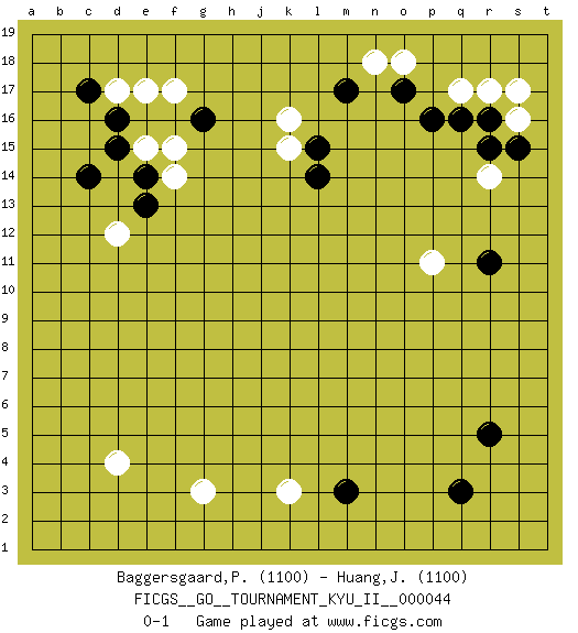 Last move : 0-1 2013 January 8 23:54:51 [Event "FICGS__GO__TOURNAMENT_KYU_II__000044"] [Site "FICGS"] [Date "2012.10.06"] [Round "1"] [Black "Baggersgaard,Poulerik"] [White "Huang,Jing"] [Result "0-1"] [Rating 1 "1100"] [Rating 2 "1100"] 1.q16 d4 2.q3 d17 3.r5 k3 4.m3 g3 5.d15 d12 6.g16 e15 7.e14 f15 8.d16 f17 9.c17 e17 10.c14 f14 11.e13 k16 12.m17 r14 13.r11 r17 14.r16 q17 15.p16 s16 16.s15 s17 17.r15 o18 18.o17 n18 19.l15 k15 20.l14 p11 0-1 This go game has been lost on time (started : 2012.10.06 9:35:44) Here are the names of the openings (joseki) played in the four corners : Corner d16 : d17 d15 Komoku (Somok, Xiao~mu`) 3-4 Point. The komoku (3-4) point is the traditional corner enclosure move.. Ikken Takagakari (Hankan Nop'dakeolch'im, Yi Gaogua`jiao~, 1-Space High Approach). The 5-4 approach move has become more popular in modern times, as modern Go emphasizes speed and influence. Player White won this Go (weiqi, baduk) game. Follow this game move after move (download)Everything happens on a grid-engraved board with black and white pieces, but if that's all you see then you don't know Go. (Pierre Audouard) When you stop learning you start dying. (M. Scott Adams)