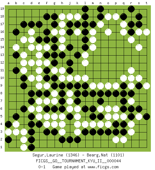 Last move : 0-1 2013 July 21 15:47:14 [Event "FICGS__GO__TOURNAMENT_KYU_II__000044"] [Site "FICGS"] [Date "2012.10.06"] [Round "1"] [Black "Segur,Laurine"] [White "Bearg,Nat"] [Result "0-1"] [Rating 1 "1346"] [Rating 2 "1101"] 1.d4 q16 2.q4 d16 3.c17 k10 4.d17 k4 5.r8 k16 6.c9 q10 7.g17 d10 8.n3 o6 9.r10 r11 10.q9 s10 11.s9 r9 12.q7 r10 13.g14 g16 14.j14 h14 15.h13 h15 16.g15 h17 17.f16 h16 18.g18 h18 19.c10 c11 20.d7 e7 21.d8 e10 22.g3 g4 23.f3 f4 24.e4 e5 25.d5 e6 26.r17 q17 27.r16 r15 28.q18 p18 29.r19 s16 30.s17 t16 31.s18 s14 32.l3 m4 33.m3 l4 34.o8 n9 35.n7 m7 36.b11 c12 37.b13 c13 38.e15 d15 39.d14 c15 40.c14 f17 41.f18 g13 42.j12 f14 43.f15 e14 44.e17 b14 45.d13 e13 46.g12 d12 47.f13 f12 48.g13 g11 49.f11 e12 50.g10 h11 51.f10 f9 52.g9 g8 53.f8 e9 54.h8 g7 55.j11 h10 56.h9 j10 57.k8 j8 58.j9 j7 59.k9 l10 60.m8 l7 61.l9 m9 62.k7 k6 63.h7 j6 64.h6 h5 65.g6 f7 66.e8 g5 67.f6 f5 68.j5 h4 69.l6 k5 70.m6 n6 71.n8 e11 72.l8 p9 73.p8 p6 74.q6 r3 75.q3 r4 76.r5 s5 77.s6 r7 78.q8 o9 79.l14 m14 80.l15 m15 81.l16 m16 82.k17 k18 83.j16 l13 84.k13 l12 85.j17 l17 86.m17 n17 87.l18 m18 88.l17 p5 89.n5 n4 90.m5 o4 91.p4 o5 92.o3 q5 93.r6 t9 94.t5 q2 95.p3 p2 96.j2 k3 97.k2 h3 98.h2 d6 99.c6 j18 100.l19 m19 101.n18 o18 102.n19 o16 103.b16 d14 104.b5 c3 105.d3 b3 106.d2 c2 107.d1 c1 108.a2 b4 109.a4 a3 0-1 This go game has been lost on time (started : 2012.10.06 9:35:44) Here are the names of the openings (joseki) played in the four corners : Corner d16 : d16 c17 Hoshi (Hwajeom, Seongjeom, Xingwei`) 4-4 Point. The star or hoshi (4-4) point, emphasizing influence at the potential expense of territory. Player White won this Go (weiqi, baduk) game. Follow this game move after move (download)Error is one of the sources of transformation. (Pierre Audouard) True nature is revealed in times of difficulty. (Chinese proverb)