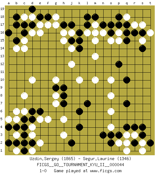 Last move : 1-0 2013 January 17 16:0:27 [Event "FICGS__GO__TOURNAMENT_KYU_II__000044"] [Site "FICGS"] [Date "2012.10.06"] [Round "1"] [Black "Uzdin,Sergey"] [White "Segur,Laurine"] [Result "1-0"] [Rating 1 "1865"] [Rating 2 "1346"] 1.q16 d4 2.q4 d16 3.q10 d10 4.k4 h15 5.k16 h3 6.k14 j12 7.h17 f17 8.c17 c14 9.d17 e16 10.c16 d18 11.e18 e17 12.f18 c18 13.b18 b16 14.b15 b14 15.a16 c15 16.b17 k10 17.k6 h5 18.n3 m10 19.h7 g7 20.h8 g8 21.h9 g10 22.c3 d3 23.c4 c6 24.d2 e2 25.c2 a5 26.d5 e5 27.c5 b6 28.d6 c8 29.e6 f5 30.a2 b1 31.a4 b5 32.b4 d1 33.c1 b3 34.b2 r3 35.r4 q3 36.p3 p2 37.o2 q1 38.s3 s2 39.r2 q2 40.t2 s1 41.s4 o4 42.o3 o6 43.q7 o8 44.j2 o10 45.p12 m13 46.l7 m15 47.n17 l16 48.l17 o15 49.o16 p15 50.q15 p16 51.p17 n16 52.o17 m17 53.m18 m16 54.l18 j16 55.j15 h16 56.j17 j14 57.k15 g18 58.d19 g17 59.g9 q18 60.q17 r17 61.r16 s17 62.p18 s15 63.s16 t16 64.s14 1-0 Here are the names of the openings (joseki) played in the four corners : Player Black won this Go (weiqi, baduk) game. Follow this game move after move (download)Capture what you cut off. (Anonymous) Train yourself to let go of everything you fear to lose. (Master Yoda in Star Wars ep.3)