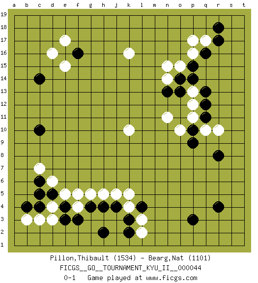 Last move : 0-1 2013 February 4 13:46:16 [Event "FICGS__GO__TOURNAMENT_KYU_II__000044"] [Site "FICGS"] [Date "2012.10.06"] [Round "1"] [Black "Pillon,Thibault"] [White "Bearg,Nat"] [Result "0-1"] [Rating 1 "1534"] [Rating 2 "1101"] 1.q16 d4 2.r4 d16 3.p3 k10 4.c10 q10 5.r8 k16 6.c14 k4 7.f16 e17 8.c6 e15 9.q12 p12 10.q11 p11 11.q13 p13 12.p14 q17 13.r17 p17 14.r18 p16 15.p15 o15 16.o14 n15 17.n13 n14 18.o13 r10 19.p10 o10 20.p9 n11 21.f3 f4 22.g4 g5 23.e4 f5 24.e3 e5 25.d5 d3 26.c4 c3 27.b4 b3 28.h4 h5 29.j4 j5 30.k3 l3 31.k2 l2 32.l4 k5 33.h2 d6 34.c5 c7 0-1 This go game has been lost on time (started : 2012.10.06 9:35:44) Here are the names of the openings (joseki) played in the four corners : Corner d16 : d16 c14 Hoshi (Hwajeom, Seongjeom, Xingwei`) 4-4 Point. The star or hoshi (4-4) point, emphasizing influence at the potential expense of territory. Ikken Kakari (Hankan Keolch'im, Yi Gua`jiao~, 1-Space Low Approach). Black 2 is the standard approach move to the 4-4. Corner d4 : d4 c6 Hoshi (Hwajeom, Seongjeom, Xingwei`) 4-4 Point. The star or hoshi (4-4) point, emphasizing influence at the potential expense of territory. Ikken Kakari (Hankan Keolch'im, Yi Gua`jiao~, 1-Space Low Approach). Black 2 is the standard approach move to the 4-4. Player White won this Go (weiqi, baduk) game. Follow this game move after move (download)Strange things happen at the one-two points. (Anonymous) Establishing goals is all right if you don't let them deprive you of interesting detours. (Doug Larson)