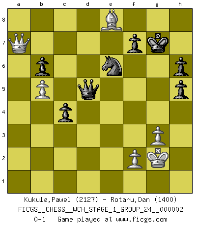 Last move : 0-1 2007 April 4 20:53:5 [Event "FICGS__CHESS__WCH_STAGE_1_GROUP_24__000002"] [Site "FICGS"] [Date "2007.01.16"] [Round "1"] [White "Kukula,Pawel"] [Black "Rotaru,Dan"] [Result "0-1"] [WhiteElo "2127"] [BlackElo "1400"] 1.d4 Nf6 2.Nf3 d5 3.e3 c5 4.c3 Qc7 5.Nbd2 Nbd7 6.Bd3 e5 7.e4 exd4 8.exd5 dxc3 9.bxc3 Nxd5 10.O-O Be7 11.Re1 O-O 12.Nc4 N7f6 13.Qb3 Be6 14.a4 Rfe8 15.g3 Rad8 16.Qc2 h6 17.Bb2 Bf8 18.Nfe5 g6 19.Re2 Bg7 20.Rae1 Bh3 21.Bc1 Re6 22.Bb2 Nd7 23.Nxd7 Rxe2 24.Bxe2 Bxd7 25.Bf3 Bc6 26.Bg2 Qd7 27.a5 Re8 28.Rxe8+ Qxe8 29.Qd2 Qe6 30.a6 b6 31.h4 Kh7 32.Na3 Qd7 33.Qc1 Ba4 34.Bf3 Nc7 35.c4 Nxa6 36.h5 gxh5 37.Nb5 Bxb2 38.Qxb2 Bxb5 39.cxb5 Nc7 40.Bc6 Qe6 41.Qb1+ Kg8 42.Qd1 Qe5 43.Qa4 Ne6 44.Kg2 Kg7 45.Qxa7 c4 46.Be8 Qd5+ 0-1 Queen's pawn game Kingside Castling by player White (move 10) Kingside Castling by player Black (move 11) Player Black won this chess game. Follow this game move after move (download)Combinations have always been the most intriguing aspect of Chess. The masters look for them, the public applauds them, the critics praise them. It is because combinations are possible that Chess is more than a lifeless mathematical exercise. They are the poetry of the game; they are to Chess what melody is to music. They represent the triumph of mind over matter. (Reuben Fine) Wie bekannt hörte Morphy 1859 auf, Schach zu spielen. Seine Enttäuschung galt nicht so sehr dem Schach, wie den Schachspielern. (Robert James Fischer) La pasion por jugar al Ajedrez es una de las mas inexplicables en el mundo. (H.G. Wells) On peut tirer plus d'utilité d'une partie perdue que de 100 parties gagnées. (Capablanca) Mandala - that's it! 16x16 squares as multiple of the four and the eight because of the Four Noble Truths and the Noble Eightfold Path. (Heinz-Georg Lehnhoff about Big Chess)