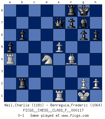 Last move : 0-1 2012 October 29 22:50:32 [Event "FICGS__CHESS__CLASS_F__000117"] [Site "FICGS"] [Date "2012.10.08"] [Round "1"] [White "Neil,Charlie"] [Black "Benreguia,Frederic"] [Result "0-1"] [WhiteElo "1181"] [BlackElo "1064"] 1.d4 d5 2.c4 dxc4 3.Nc3 c6 4.a4 a5 5.e3 g6 6.Bxc4 e6 7.Nf3 Bg7 8.O-O Ne7 9.Re1 O-O 10.Bd2 Nd7 11.e4 e5 12.d5 cxd5 13.Nxd5 b6 14.Qb3 Nxd5 15.Bxd5 Nc5 16.Qb5 Bd7 17.Qc4 Rc8 18.Ng5 Qe7 19.f4 h6 20.Nf3 exf4 21.Bxf4 Nxa4 22.Qxa4 Bxa4 23.Rxa4 Rc2 24.Bb3 Rxb2 25.e5 Rxb3 26.Nd4 Rb2 0-1 Queen's gambit accepted Kingside Castling by player White (move 8) Kingside Castling by player Black (move 9) Player Black won this chess game. Follow this game move after move (download)For surely of all the drugs in the world, Chess must be the most permanently pleasurable. (Assiac) Der Traum, für den ich lebe, ist der von einem freien Russland. Viele mögen sagen: Russland hat doch ein Parlament, einen gewählten Präsidenten. Aber ich spüre, dass in meiner Heimat die Angst wiederkehrt. Eine Angst, sich frei zu äußern, bestimmte Dinge zu tun (Garry Kasparov) Todos los jugadores de Ajedrez deberían tener un pasatiempo. (Savielly Tartakower) Plusieurs personnes se sont demandées comment Tal faisait pour gagner... En fait, c'est très simple ! Il met ses pièces au centre de l'échiquier et les sacrifie quelque part ! (David Bronstein) Vladimir Ras-Putin is still alive... He is also a good actor, I saw him in the Lord of the Rings. (Rodolfo d'Ettorre)