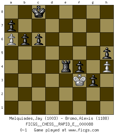Last move : 0-1 2012 October 11 22:3:18 [Event "FICGS__CHESS__RAPID_E__000088"] [Site "FICGS"] [Date "2012.10.08"] [Round "1"] [White "Melquiades,Jay"] [Black "Bromo,Alexis"] [Result "0-1"] [WhiteElo "1003"] [BlackElo "1188"] 1.e4 c6 2.Nf3 d5 3.Nc3 Bg4 4.h3 Bxf3 5.Qxf3 e6 6.d4 Bb4 7.a3 Ba5 8.b4 Bb6 9.Na4 Bxd4 10.c3 Be5 11.Bf4 Nd7 12.g4 Ngf6 13.g5 Nxe4 14.Bxe5 Nxe5 15.Qh5 Nxg5 16.Bg2 Nd3+ 17.Kf1 Qf6 18.Ra2 Ne4 19.Qf3 Qxf3 20.Bxf3 h5 21.Nc5 Nexc5 22.bxc5 Nxc5 23.a4 g5 24.h4 g4 25.Be2 f5 26.a5 f4 27.f3 g3 28.Kg2 e5 29.Re1 O-O-O 30.a6 b6 31.c4 d4 32.Bd1 Rhe8 33.Bc2 d3 34.Rb2 dxc2 35.Rxc2 e4 36.fxe4 Nxe4 37.Rce2 Rd4 38.Kf3 Rxc4 39.Rxe4 R8xe4 40.Rxe4 Rxe4 0-1 Caro-Kann defense Queenside Castling by player Black (move 29) Player Black won this chess game. Follow this game move after move (download)I am the best player in the world and I am here to prove it. (Bobby Fischer) Obendrein hat der FIDE-Präsident den Revolutionsführer Gaddafi zum »Großmeister« ernannt, am Ende der WM. Das ist lächerlich! (Joel Lautier) La partida mas dura de ganar es una partida ganada. (Emanuel Lasker) Avant la finale, les dieux ont créé le milieu de partie. (Tarrasch) Patience, use the Force, think ! (Obi-Wan Kenobi in Star Wars ep.2)