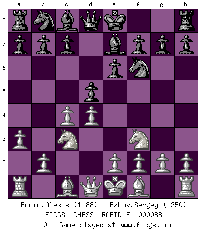 Last move : 1-0 2012 November 12 10:30:13 [Event "FICGS__CHESS__RAPID_E__000088"] [Site "FICGS"] [Date "2012.10.08"] [Round "1"] [White "Bromo,Alexis"] [Black "Ezhov,Sergey"] [Result "1-0"] [WhiteElo "1188"] [BlackElo "1250"] 1.d4 d5 2.c4 e6 3.Nc3 Nf6 4.Nf3 Be7 5.a3 1-0 This chess game has been lost on time (started : 2012.10.08 22:57:13) QGD : 4.Nf3 Player White won this chess game. Follow this game move after move (download)The chessboard is the world, the pieces are the phenomena of the Universe, the rules of the game are what we call the laws of Nature and the player on the other side is hidden from us. (Thomas Huxley) Es liegt in der Natur, vernüftig zu denken und unlogisch zu handeln. (Anatole France) La mitad de las variaciones que son calculadas en una partida de torneo, resultan ser completamente superfluas. Desafortunadamente, nadie sabe por adelantado cual mitad. (Jan Tinman) Dieu déplace le joueur, et celui-ci la pièce. Quel Dieu derrière Dieu commence donc la trame ? Arturo Perez-Reverte (prix de littérature policière 1993). All battles are fought by scared men who'd rather be someplace else. (John Wayne in the movie In harm's way)