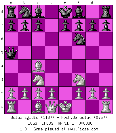 Last move : 1-0 2012 November 15 22:10:44 [Event "FICGS__CHESS__RAPID_E__000088"] [Site "FICGS"] [Date "2012.10.08"] [Round "1"] [White "Belaz,Egidio"] [Black "Pech,Jaroslav"] [Result "1-0"] [WhiteElo "1187"] [BlackElo "0757"] 1.e4 d5 2.exd5 Qxd5 3.Nc3 Qa5 4.Nf3 Nf6 5.Bc4 1-0 Scandinavian (centre counter) defense Player White won this chess game. Follow this game move after move (download)Even the laziest King flees wildly in the face of a double check ! (Aaron Nimzowitsch) Ein unbeabsichtigtes Patt ist der Gipfel der Dummheit. (Anonymous) La señal de un Gran Maestro es su habilidad de ganar una partida rápidamente y sin dolor. (Irving Chernev) Les sacrifices démontrent seulement que quelqu'un a gaffé. (Savielly Tartacover) War is the child of passion, passion is the child of narcissism and narcissism is the child. (...) Another game ? (Thibault de Vassal)