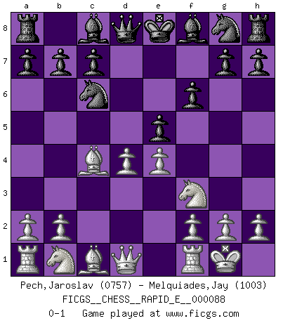 Last move : 0-1 2012 November 14 22:41:40 [Event "FICGS__CHESS__RAPID_E__000088"] [Site "FICGS"] [Date "2012.10.08"] [Round "1"] [White "Pech,Jaroslav"] [Black "Melquiades,Jay"] [Result "0-1"] [WhiteElo "0757"] [BlackElo "1003"] 1.d4 d5 2.c4 dxc4 3.Nf3 f6 4.e4 Nc6 5.Bxc4 e6 6.O-O e5 0-1 This chess game has been lost on time (started : 2012.10.08 22:57:13) QGA : 3.Nf3 Kingside Castling by player White (move 6) Player Black won this chess game. Follow this game move after move (download)Chess is a matter of delicate judgment, knowing when to punch and how to duck. (Bobby Fischer) Es war undenkbar für die Behörden, dass ein sowjetischer Großmeister auf diese Art und Weise [Fischer-Taimanov 6:0] verliert, ohne dass es eine politischer Erklärung dafür gäbe. (Mark Taimanov) Me gusta decir que Bobby Fischer fue el mejor jugador que jamás haya existido. Pero lo que hizo de Fischer un genio, fue su habilidad de mezclar una frescura y pragmatismo Americano con ideas Rusas acerca de la estrategia. (Bruce Pandolfini) Le jeu d'échecs fait naître et fortifie en nous plusieurs qualités précieuses dans le cours de l'existence, telles que la prévoyance, la circonspection, la prudence, et la persévérance. (Benjamin Franklin - 1783, la morale des échecs) Excelling at chess has long been considered a symbol of more general intelligence. That is an incorrect assumption in my view, as pleasant as it might be. But for the purposes of argument and investigation, chess is, in Russkin-Gutman's words, 'an unparalleled laboratory, since both the learning process and the degree of ability obtained can be objectified and quantified, providing an excellent comparative framework on which to use rigorous analytical techniques.' (The Chess Master and the Computer, by Garry Kasparov - 2010)