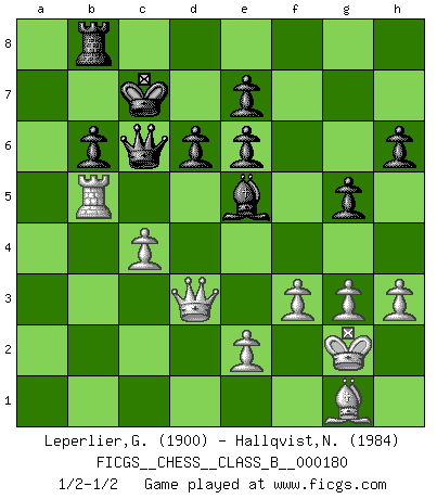 Last move : 1/2-1/2 2013 January 5 10:25:37 [Event "FICGS__CHESS__CLASS_B__000180"] [Site "FICGS"] [Date "2012.10.09"] [Round "1"] [White "Leperlier,Gabriel"] [Black "Hallqvist,Niklas"] [Result "1/2-1/2"] [WhiteElo "1900"] [BlackElo "1984"] 1.Nf3 c5 2.c4 b6 3.Nc3 Nf6 4.g3 Bb7 5.Bg2 g6 6.O-O Bg7 7.d4 cxd4 8.Qxd4 d6 9.b3 Nbd7 10.Be3 Nc5 11.Qh4 h6 12.Nd4 Qd7 13.Rad1 O-O-O 14.Bh3 Ne6 15.Nxe6 fxe6 16.Qd4 Kb8 17.Qd3 g5 18.Bg2 Ng4 19.Bxb7 Ne5 20.Qc2 Qxb7 21.Nb5 Bf6 22.Nd4 Qd7 23.a4 Nc6 24.b4 Nxb4 25.Qb3 Nc6 26.Nxc6+ Qxc6 27.a5 Kc7 28.axb6+ axb6 29.Rb1 Rb8 30.Qd3 Rb7 31.Rb5 Ra8 32.h3 Ra1 33.Rxa1 Bxa1 34.f3 Be5 35.Kg2 Rb8 36.Bg1 1/2-1/2 Reti Opening Kingside Castling by player White (move 6) Queenside Castling by player Black (move 13) This chess game ended in a draw. Follow this game move after move (download)Play the opening like a book, the middle game like a magician, and the endgame like a machine. (Spielmann) Taktik ist was man tun muß, wenn etwas zu tun ist. Strategie ist was man tun muß, wenn nichts zu tun ist. (Savielly Grigorievitsch Tartakower) El ganador de una partida es aquel jugador que hace el penúltimo error. (Savielly Tartakover) Nous vivons dans un monde échiquéen : chaque jour qui passe est un défi à relever. (Philosophe Sasha) He is a liar. I just don't know what the lie is yet. (Horatio Caine, C.S.I. Miami)
