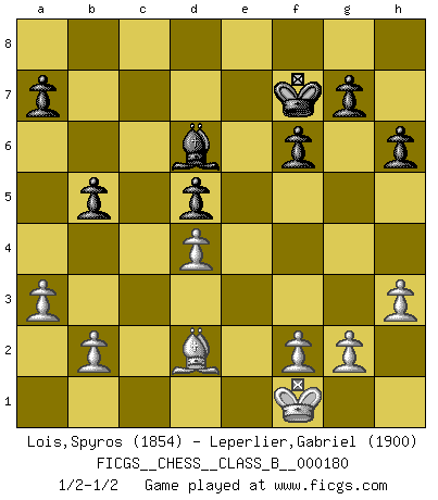 Last move : 1/2-1/2 2012 December 26 17:16:33 [Event "FICGS__CHESS__CLASS_B__000180"] [Site "FICGS"] [Date "2012.10.09"] [Round "1"] [White "Lois,Spyros"] [Black "Leperlier,Gabriel"] [Result "1/2-1/2"] [WhiteElo "1854"] [BlackElo "1900"] 1.e4 e5 2.Nf3 Nf6 3.Nxe5 d6 4.Nf3 Nxe4 5.d4 d5 6.Be2 Bd6 7.O-O Be6 8.c4 dxc4 9.Qc2 Nf6 10.Bxc4 Bxc4 11.Qxc4 O-O 12.h3 c6 13.Nc3 Nbd7 14.Re1 Qc7 15.Be3 Nb6 16.Qd3 h6 17.Qf5 Nbd5 18.Bd2 Rae8 19.Nxd5 Nxd5 20.Rad1 Rxe1+ 21.Rxe1 Qc8 22.Qe4 Nf6 23.Qb1 Re8 24.Ne5 Re6 25.Qd1 Nd5 26.Qb3 Re7 27.a3 f6 28.Nd3 Rxe1+ 29.Nxe1 Kf7 30.Nc2 b5 31.Ne3 Qe6 32.Nxd5 Qxd5 33.Qxd5+ cxd5 34.Kf1 1/2-1/2 Petrov : Classical attack Kingside Castling by player White (move 7) Kingside Castling by player Black (move 11) This chess game ended in a draw. Follow this game move after move (download)Chess mastery essentially consists of analyzing Chess positions accurately. (Mikhail Botvinnik) Ich moechte nie einem Club beitreten, der Leute wie mich als Mitglieder aufnimmt. (Woody Allen) No hay un Gran Maestro de Ajedrez que sea normal; solo se diferencían ellos por la magnitud de su locura. (Viktor Korchnoi) Les échecs sont utiles à l'exercice de la faculté de penser et à celle de l'imagination. Car nous devons posséder une méthode élaborée pour atteindre des buts partout où nous devons conduire notre raison. (Leibnitz) There is no vagueness without wind. (Chinese proverb)