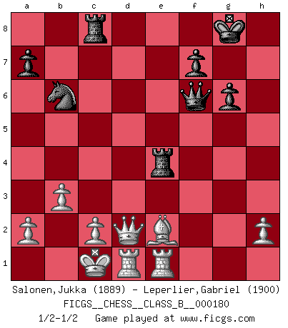 Last move : 1/2-1/2 2012 November 23 18:7:45 [Event "FICGS__CHESS__CLASS_B__000180"] [Site "FICGS"] [Date "2012.10.09"] [Round "1"] [White "Salonen,Jukka"] [Black "Leperlier,Gabriel"] [Result "1/2-1/2"] [WhiteElo "1889"] [BlackElo "1900"] 1.e4 e5 2.Nf3 d6 3.d4 exd4 4.Nxd4 Nf6 5.Nc3 Be7 6.Bf4 O-O 7.Qd2 Nc6 8.O-O-O Nxd4 9.Qxd4 Be6 10.Be2 Re8 11.Rhe1 Nd7 12.Nd5 Bxd5 13.Qxd5 Nb6 14.Qxb7 Bg5 15.g3 Bxf4+ 16.gxf4 Rb8 17.Qc6 Qh4 18.Qxc7 Qxf2 19.b3 g6 20.f5 Rbc8 21.Qxd6 Rxe4 22.fxg6 hxg6 23.Qd2 Qf6 1/2-1/2 Philidor : Exchange variation Kingside Castling by player Black (move 6) Queenside Castling by player White (move 8) This chess game ended in a draw. Follow this game move after move (download)During a Chess competition a Chessmaster should be a combination of a beast of prey and a monk. (Alexander Alekhine) Ich glaube, ich kenne inzwischen die Gründe für mein Versagen: schachliche Charakterfehler. Ich war nie ein Wunderkind und in meiner gesamten menschlichen Entwicklung immer zu langsam. (Viktor Kortschnoi) Si el ingenio solamente fuese necesario para lucirse, las mujeres serían las mejores jugadoras de Ajedrez del mundo. (Albin) Le profane ne songe pas à la somme de jouissance dont il se prive, qui méconnaît ce jeu aux ressources aussi variées que passionnantes. (Jean-Marie Jeanton-Lamarche) Control your own destiny or someone else will. (Jack Welch)