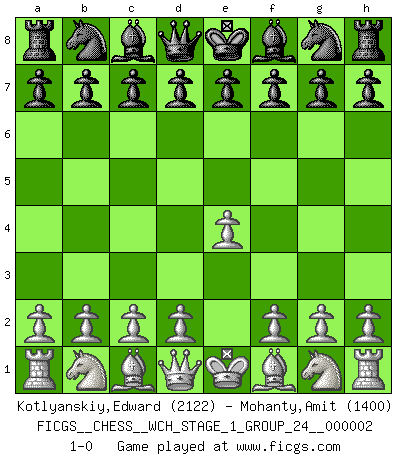 Last move : 1-0 2007 February 15 22:29:16 [Event "FICGS__CHESS__WCH_STAGE_1_GROUP_24__000002"] [Site "FICGS"] [Date "2007.01.16"] [Round "1"] [White "Kotlyanskiy,Edward"] [Black "Mohanty,Amit"] [Result "1-0"] [WhiteElo "2122"] [BlackElo "1400"] 1.e4 1-0 This chess game has been lost on time (started : 2007.01.16 15:37:2) King's pawn Opening Player White won this chess game. Follow this game move after move (download)If your opponent cannot do anything active, then don't rush the position; instead you should let him sit there, suffer, and beg you for a draw. (Jeremy Silman) Ich moechte nie einem Club beitreten, der Leute wie mich als Mitglieder aufnimmt. (Woody Allen) Preferería tener un Peón que un dedo. (Reuben Fine) Toutes les manuvres exécutées sur une colonne ouverte ont pour but ultime l'intrusion définitive sur la septième ou la huitième rangée, en plein cur de la position ennemie. (Aaron Nimzovitch) Rules and bones are meant to be broken. (Anonymous)