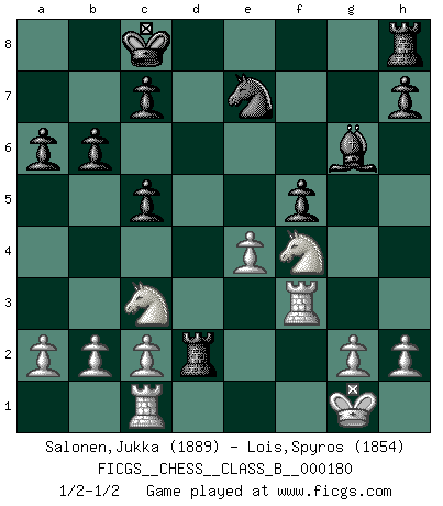Last move : 1/2-1/2 2012 December 3 16:3:34 [Event "FICGS__CHESS__CLASS_B__000180"] [Site "FICGS"] [Date "2012.10.09"] [Round "1"] [White "Salonen,Jukka"] [Black "Lois,Spyros"] [Result "1/2-1/2"] [WhiteElo "1889"] [BlackElo "1854"] 1.e4 e5 2.Nf3 Nc6 3.Bb5 a6 4.Bxc6 dxc6 5.O-O f6 6.d4 exd4 7.Nxd4 c5 8.Nb3 Qxd1 9.Rxd1 Bd6 10.Na5 Be5 11.f4 Bd6 12.Nc3 Bg4 13.Rd3 O-O-O 14.Nc4 Be7 15.f5 Rd4 16.Rg3 Bh5 17.Ne3 g5 18.fxg6 Bxg6 19.Ned5 Bd6 20.Bf4 Bxf4 21.Nxf4 Ne7 22.Re1 Rd2 23.Rc1 b6 24.Rf3 f5 1/2-1/2 Ruy Lopez : Exchange, Gligoric variation Kingside Castling by player White (move 5) Queenside Castling by player Black (move 13) This chess game ended in a draw. Follow this game move after move (download)He who takes the Queen's Knight's Pawn will sleep in the streets. (Anonymous) Du weisst es gibt ein Problem mit Computern und Fernschach, wenn jeder eine Rating von 2450 hat. (John Christen Knudsen) Bobby solo arroja las piezas y solas caen en las casillas correctas. (Miguel Najdorf ) Il n'y a plus de joueurs du niveau de Jacob Murray dont la seule quête est le beau jeu, le plaisir de voir les pièces construire quelque chose. Sur 10 idées à la minute, 9 seront sans intérêt, la dernière s'avèrera géniale. (Christian Bauer) A generalist learns less and less about more and more until he knows nothing about everything. (Author unknown)