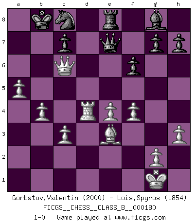 Last move : 1-0 2012 November 28 22:20:49 [Event "FICGS__CHESS__CLASS_B__000180"] [Site "FICGS"] [Date "2012.10.09"] [Round "1"] [White "Gorbatov,Valentin"] [Black "Lois,Spyros"] [Result "1-0"] [WhiteElo "2000"] [BlackElo "1854"] 1.e4 e5 2.Nf3 Nc6 3.Bb5 a6 4.Bxc6 dxc6 5.O-O f6 6.h3 Bc5 7.Qe2 Be6 8.Rd1 Qd6 9.c3 O-O-O 10.b4 Ba7 11.d4 Ne7 12.Be3 Ng6 13.a4 exd4 14.Nxd4 Rhe8 15.Rd2 Bxd4 16.Rxd4 Qe5 17.Nd2 Kb8 18.Rd1 Bg8 19.Nc4 Qe7 20.Na5 Rxd4 21.Rxd4 Ne5 22.f4 Nd7 23.Nxc6+ bxc6 24.Qxa6 Nb6 25.a5 Nc8 26.Qxc6 1-0 Ruy Lopez : Exchange, Gligoric variation Kingside Castling by player White (move 5) Queenside Castling by player Black (move 9) Player White won this chess game. Follow this game move after move (download)I like the moment when I break a man's ego. (Bobby Fischer) Im Internet Chess Club betrug mein Rating vorübergehend 3350 ELO-Punkte. (Sergej Karjakin) El Ajedrez expande y enriquece tu mente. (Saudin Robovic) La vie est comme un jeu d'échecs : nous esquissons un plan, mais celui-ci est tributaire de ce que daignent faire l'adversaire aux échecs et le destin dans la vie. (Arthur Schopenhauer) Ah, beer! The cause of, and the solution to, all of life's problems. (Homer Simpson)