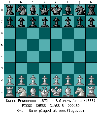 Last move : 0-1 2012 November 18 10:54:34 [Event "FICGS__CHESS__CLASS_B__000180"] [Site "FICGS"] [Date "2012.10.09"] [Round "1"] [White "Dunne,Francesco"] [Black "Salonen,Jukka"] [Result "0-1"] [WhiteElo "1872"] [BlackElo "1889"] 0-1 This chess game has been lost on time (started : 2012.10.09 7:36:37) Player Black won this chess game. Follow this game move after move (download)All I want to do, ever, is just play Chess. (Bobby Fischer) Capablanka war das größte Genie der Schachgeschichte! Aber denken sie nicht er habe nichts vom Schach verstanden. Er wusste nur soviel wie er wissen musste um seine Ziele zu erreichen. (Mikhail Moiseyevich Botvinik) Tu cuerpo tiene que estar en óptima condición. Tu Ajedrez se deteriora como lo hace tu cuerpo. No puedes separar la mente y el cuerpo. (Bobby Fischer) J'ai vu le vaincu d'Echecs jouer des années durant dans l'espoir de la fête de la victoire. Car tu es plus riche de ce qu'elle existe si même elle n'est point pour toi. Ainsi de la perle du fond des mers. (Antoine de Saint-Exupéry) Quotation,n.: The act of repeating erroneously the words of another. The words erroneously repeated. (Ambrose Bierce, The Devil's Dictionary)