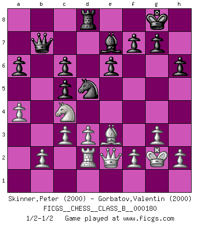 Last move : 1/2-1/2 2012 October 25 9:39:53 [Event "FICGS__CHESS__CLASS_B__000180"] [Site "FICGS"] [Date "2012.10.09"] [Round "1"] [White "Skinner,Peter"] [Black "Gorbatov,Valentin"] [Result "1/2-1/2"] [WhiteElo "2000"] [BlackElo "2000"] 1.e4 c5 2.Nf3 Nc6 3.Bb5 e6 4.O-O Nge7 5.c3 a6 6.Ba4 d5 7.exd5 Nxd5 8.Ne5 Bd7 9.Nxc6 Bxc6 10.Bxc6+ bxc6 11.d3 Bd6 12.Nd2 Qc7 13.g3 O-O 14.Re1 h6 15.Nc4 Rfd8 16.a4 Qd7 17.Ra3 Bc7 18.Rb3 Rab8 19.Rxb8 Rxb8 20.Qe2 Rd8 21.Qh5 Bd6 22.Be3 Bf8 23.Rd1 Bd6 24.Qg4 Nf6 25.Qh4 Be7 26.Qf4 Qb7 27.Qf3 Nd5 28.Re1 Qb3 29.Qd1 Qb7 30.Re2 Qd7 31.Rd2 Qc7 32.Kg2 Qb7 33.Qg4 Nf6 34.Qf3 Nd5 35.Qe2 Qb3 36.Qd1 Qb7 37.Qg4 Nf6 38.Qf3 Nd5 39.Qe2 1/2-1/2 Sicilian : Nimzovich-Rossolimo attack (without ...d6) Kingside Castling by player White (move 4) Kingside Castling by player Black (move 13) This chess game ended in a draw. Follow this game move after move (download)Chess is a beautiful mistress. (Bent Larsen) Ein unbeabsichtigtes Patt ist der Gipfel der Dummheit. (Anonymous) Cuando la partida de Ajedrez termina, el Peón y el Rey regresan a la misma caja. (Irish saying) Les ravages du H expliquent la différence de niveau entre Tal et Thal [Abergel]. Wisdom begins at the end. (Daniel Webster)
