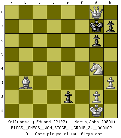 Last move : 1-0 2007 February 15 3:23:13 [Event "FICGS__CHESS__WCH_STAGE_1_GROUP_24__000002"] [Site "FICGS"] [Date "2007.01.16"] [Round "1"] [White "Kotlyanskiy,Edward"] [Black "Marin,John"] [Result "1-0"] [WhiteElo "2122"] [BlackElo "0800"] 1.e4 e5 2.Nf3 Nc6 3.Bb5 a6 4.Ba4 Nf6 5.O-O b5 6.Bb3 Bb7 7.d3 Bd6 8.a4 Na5 9.Ba2 O-O 10.h3 bxa4 11.Nc3 a3 12.bxa3 Nc6 13.Be3 Rb8 14.Qd2 Qe7 15.Nd5 Nxd5 16.exd5 Nd8 17.Rab1 c6 18.c4 cxd5 19.cxd5 Kh8 20.a4 Rc8 21.Rfc1 Bc7 22.Rc4 d6 23.a5 f6 24.Rbc1 Qd7 25.Qb4 Kg8 26.Bb3 Rf7 27.Bb6 Bxb6 28.axb6 Rxc4 29.dxc4 Kh8 30.c5 dxc5 31.Qxc5 g6 32.Nd2 a5 33.Qxa5 Qe8 34.Ne4 Qf8 35.Rc7 Kg7 36.Qc5 f5 37.Nd6 f4 38.Nxf7 Qxc5 39.Nxd8 Qxc7 40.bxc7 Bc8 41.d6 Kf6 42.Nb7 e4 43.Nc5 e3 44.fxe3 Bf5 45.d7 Bxd7 46.Nxd7+ Ke7 47.c8Q fxe3 48.Ne5 Kf6 49.Qe6+ Kg7 50.Ng4 e2 51.Qg8+ 1-0 Ruy Lopez : Archangelsk (counterthrust) variation Kingside Castling by player White (move 5) Kingside Castling by player Black (move 9) Promotion Queen by player White (move 47) 10 pieces endgame at move 47 : White KQBNPP , Black KPPP WHITE : King + 1 Queen 1 Bishop 1 Knight 2 Pawns BLACK : King + 3 Pawns Player White won this chess game. Follow this game move after move (download)My God, Bobby Fischer plays so simply. (Alexei Suetin) Wenn ich mich einlogge, glauben die Leute gewöhnlich nicht, dass ich es selbst bin und sie fangen an, mir dumme Fragen zu stellen. Und wenn sie es glauben, stellen sie wieder andere dumme Fragen. (Judith Polgar) En el tablero, la mentira e hipocresía no sobreviven mucho. (Emanuel Lasker) Les Echecs représentent une sphère d'idées créatrices basée sur la volonté des deux protagonistes. (Smyslov) Hold em is to stud what chess is to checkers. (Johnny Moss)