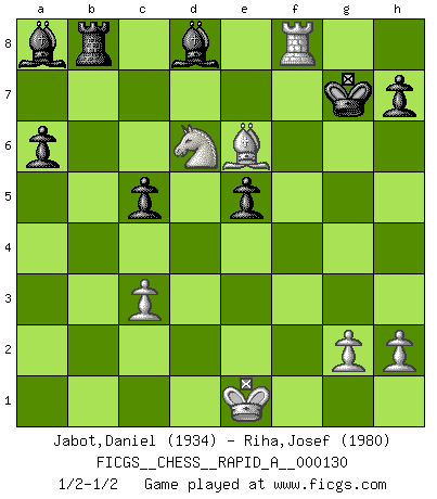 Last move : 1/2-1/2 2012 November 5 22:5:12 [Event "FICGS__CHESS__RAPID_A__000130"] [Site "FICGS"] [Date "2012.10.10"] [Round "1"] [White "Jabot,Daniel"] [Black "Riha,Josef"] [Result "1/2-1/2"] [WhiteElo "1934"] [BlackElo "1980"] 1.e4 c5 2.Nf3 d6 3.d4 cxd4 4.Nxd4 Nf6 5.Nc3 a6 6.Bg5 e6 7.f4 Qb6 8.Qd2 Qxb2 9.Rb1 Qa3 10.f5 Nc6 11.fxe6 fxe6 12.Nxc6 bxc6 13.e5 dxe5 14.Bxf6 gxf6 15.Ne4 Qxa2 16.Nxf6+ Kf7 17.Rd1 Qb2 18.Ne4 Bb4 19.c3 Qxd2+ 20.Rxd2 Ba5 21.Be2 Ke7 22.Rf1 Bb7 23.Rb2 Rab8 24.Bh5 Rhf8 25.Rxf8 Kxf8 26.Rf2+ Kg8 27.Rf7 Bd8 28.Nd6 Ba8 29.Bg4 c5 30.Bxe6 Kh8 31.Rf8+ Kg7 32.Rf7+ Kh8 33.Rf8+ Kg7 1/2-1/2 Sicilian : Najdorf, 7...Qb6 This chess game ended in a draw. Follow this game move after move (download)Good offense and good defense both begin with good development. (Bruce A. Moon) Wenn Du absolut nicht mehr weißt, was Du tun sollst, dann ist es Zeit für Panik. (John van der Wiel) Debemos de asegurarnos de que el Ajedrez no se convierta en un lenguaje muerto, muy interesante, pero tan solo para un grupo muy pequeño. (Sytze Faber) La vie et les Echecs sont tous les deux une lutte constante. (Lasker) Good luck. You're gonna need it. (Han Solo in Star Wars ep.6)