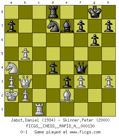 Last move : 0-1 2012 November 30 22:26:41 [Event "FICGS__CHESS__RAPID_A__000130"] [Site "FICGS"] [Date "2012.10.10"] [Round "1"] [White "Jabot,Daniel"] [Black "Skinner,Peter"] [Result "0-1"] [WhiteElo "1934"] [BlackElo "2000"] 1.e4 e5 2.f4 exf4 3.Nf3 Be7 4.d4 Bh4+ 5.Ke2 d5 6.exd5 Bg4 7.c4 Nf6 8.Nc3 O-O 9.Kd2 c6 10.Qb3 c5 11.Kc2 cxd4 12.Na4 b5 13.cxb5 Nxd5 14.Bd2 Ne3+ 15.Bxe3 fxe3 16.Rc1 Qf6 17.Kb1 Nd7 18.Be2 Rac8 19.Ka1 Rxc1+ 20.Rxc1 Rd8 21.h3 Bxf3 22.gxf3 Qf4 23.a3 Be7 24.Ka2 g6 0-1 KGA : Cunningham defense Kingside Castling by player Black (move 8) Player Black won this chess game. Follow this game move after move (download)The most important feature of the Chess position is the activity of the pieces. This is absolutely fundamental in all phases of the game: Opening, Middlegame and especially Endgame. The primary constraint on a piece's activity is the Pawn structure. (Michael Stean) Ein Isolani verdüstert die Stimmung auf dem ganzen Schachbrett. (Savielly Grigorievitsch Tartakower) Una clavada es mas poderosa que una espada. (Fred Reinfeld) Dans le domaine de la peinture, de la gravure et de la sculpture, dès la première décennie de notre siècle, les artistes abandonnent la représentation de la partie d'échecs pour se concentrer sur les pièces, sur les échiquiers et sur toutes les variations auxquelles les unes et les autres peuvent donner lieu. On passe en quelque sorte d'un thème social à un thème musical (au sens de la musica médiévale, c'est-à-dire d'une notion qui inclue le rythme, l'harmonie, la construction et la déconstruction, etc.). Graphiquement et picturalement, l'échiquier apparaît comme une structure ouverte, dynamique, d'une richesse infinie, autorisant toutes les combinatoires et débouchant sur des mouvements et des rythmes de nature exponentielle. (Michel Pastoureau) Mac users swear by their computers. PC users swear at their computers. (Author unknown)
