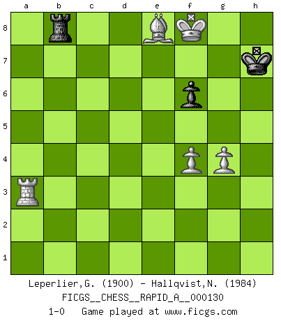 Last move : 1-0 2013 March 17 11:42:32 [Event "FICGS__CHESS__RAPID_A__000130"] [Site "FICGS"] [Date "2012.10.10"] [Round "1"] [White "Leperlier,Gabriel"] [Black "Hallqvist,Niklas"] [Result "1-0"] [WhiteElo "1900"] [BlackElo "1984"] 1.c4 b6 2.Nf3 Bb7 3.Nc3 c5 4.g3 Bxf3 5.exf3 Nc6 6.d3 e6 7.Bg2 Nge7 8.Bg5 d6 9.Ne2 h6 10.Bd2 Nf5 11.f4 Rc8 12.Bc3 Qd7 13.O-O Be7 14.a3 h5 15.b4 Bf6 16.Bxf6 gxf6 17.h4 Ncd4 18.Nxd4 Nxd4 19.Re1 a6 20.Rb1 Qa7 21.Bf3 Ke7 22.Bxh5 Rcg8 23.Kg2 Qc7 24.Rh1 cxb4 25.axb4 d5 26.Ra1 Nf5 27.Kh3 Nxh4 28.Kxh4 dxc4 29.Kh3 Qc6 30.Kh2 c3 31.Rc1 Rc8 32.f5 Qd5 33.Kg1 Qxf5 34.Qf3 Qxf3 35.Bxf3 Rxh1+ 36.Bxh1 Rc7 37.Bf3 Kd6 38.Kf1 b5 39.Bd1 Ke5 40.Ke2 Kd4 41.Bb3 Rc6 42.Rh1 a5 43.bxa5 Ra6 44.Rh4+ Ke5 45.Kd1 Rxa5 46.Kc2 Ra1 47.d4+ Kd6 48.Kxc3 f5 49.Rf4 Rb1 50.Rf3 Re1 51.Kb4 Re4 52.Rf4 Re1 53.Kxb5 Rb1 54.Kc4 Rh1 55.d5 exd5+ 56.Kc3 Ke5 57.Bc2 Rh8 58.Rxf5+ Ke6 59.Kd4 Ke7 60.Re5+ Kf6 61.Rxd5 Ke7 62.Rb5 f6 63.Bf5 Rd8+ 64.Kc5 Rd2 65.Rb7+ Kf8 66.f4 Ra2 67.Be6 Ra5+ 68.Kd6 Ra6+ 69.Kd7 Ra8 70.Rc7 Kg7 71.Ke7 Kg6 72.g4 Ra6 73.Rc8 Ra7+ 74.Kf8 Rb7 75.Ra8 Rb4 76.Bf7+ Kh7 77.Ra3 Rb8+ 78.Be8 1-0 English Opening Kingside Castling by player White (move 13) 10 pieces endgame at move 55 : White KRBPP , Black KRPPP WHITE : King + 1 Rook 1 Bishop 2 Pawns BLACK : King + 1 Rook 3 Pawns 9 pieces endgame at move 58 : White KRBPP , Black KRPP WHITE : King + 1 Rook 1 Bishop 2 Pawns BLACK : King + 1 Rook 2 Pawns 8 pieces endgame at move 61 : White KRBPP , Black KRP WHITE : King + 1 Rook 1 Bishop 2 Pawns BLACK : King + 1 Rook 1 Pawn Player White won this chess game. Follow this game move after move (download)Could we look into the head of a Chess player, we should see there a whole world of feelings, images, ideas, emotion and passion. (Alfred Binet) Schach ist die gewalttätigste aller Sportarten. (Garry Kasparov) El Ajedrez moderno está demasiado preocupado con cosas como la estructura de Peones. Olvidenlo, el Jaque Mate termina la partida. (Nigel Short) Karpov est une pièce de musée. (Garry Kasparov) Heh, heh, heh. Time to abandon ship. (General Grievous in Star Wars ep.3)