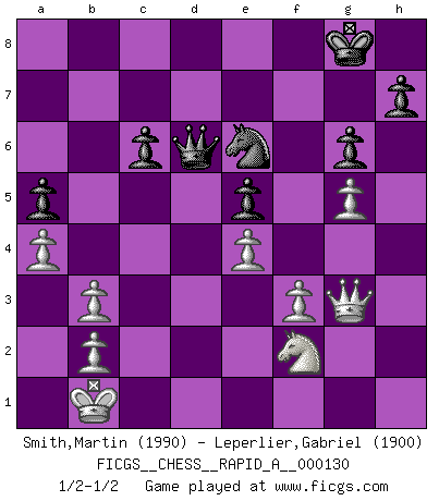 Last move : 1/2-1/2 2012 November 17 19:36:20 [Event "FICGS__CHESS__RAPID_A__000130"] [Site "FICGS"] [Date "2012.10.10"] [Round "1"] [White "Smith,Martin"] [Black "Leperlier,Gabriel"] [Result "1/2-1/2"] [WhiteElo "1990"] [BlackElo "1900"] 1.e4 e5 2.Nf3 d6 3.d4 exd4 4.Nxd4 Nf6 5.Nc3 Be7 6.Bf4 O-O 7.Qd2 Nc6 8.O-O-O Nxd4 9.Qxd4 Be6 10.f3 Nd7 11.Qe3 Re8 12.g4 Bf6 13.g5 Be5 14.h4 c6 15.h5 Qb6 16.Qd2 Qa5 17.Bxe5 dxe5 18.a3 Rad8 19.Qh2 b5 20.Bh3 Bxh3 21.Qxh3 Qc7 22.Qg4 Nf8 23.Kb1 a5 24.a4 b4 25.Ne2 g6 26.Nc1 Ne6 27.Nd3 Rd7 28.Qg3 b3 29.hxg6 fxg6 30.Nf2 Rxd1+ 31.Rxd1 Rd8 32.Rxd8+ Qxd8 33.cxb3 Qd6 1/2-1/2 Philidor : Exchange variation Kingside Castling by player Black (move 6) Queenside Castling by player White (move 8) This chess game ended in a draw. Follow this game move after move (download)I'd rather have a Pawn than a finger. (Reuben Fine) Man kann eine Schachpartie nur gewinnen, wenn das Gleichgewicht gestört ist. In einer Stellung mit ungestörtem Gleichgewicht ist auch das größte Genie hilflos - in der Stellung steckt dann eben kein genialer Einfall. (Wilhelm Steinitz) Yo siempre he tenido un ligero sentimiento de lástima por una persona que no tiene conocimiento del Ajedrez. (Siegbert Tarrasch) Avec des compensations pour le matériel en plus... (Anonyme) To be champion requires more than simply being a strong player; one has to be a strong human being as well. (Anatoly Karpov)