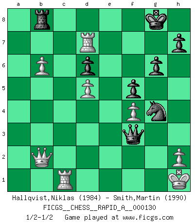 Last move : 1/2-1/2 2013 January 9 19:43:37 [Event "FICGS__CHESS__RAPID_A__000130"] [Site "FICGS"] [Date "2012.10.10"] [Round "1"] [White "Hallqvist,Niklas"] [Black "Smith,Martin"] [Result "1/2-1/2"] [WhiteElo "1984"] [BlackElo "1990"] 1.g3 e5 2.c4 Nc6 3.Nc3 g6 4.Bg2 Bg7 5.Rb1 a5 6.a3 d6 7.d3 f5 8.Nf3 Nf6 9.O-O O-O 10.b4 axb4 11.axb4 Qe8 12.b5 Nd8 13.Bb2 Ne6 14.Nd2 Qf7 15.e3 Nd7 16.Qc2 Ndc5 17.Nd5 Bd7 18.Bc3 Ra3 19.Bb4 R3a8 20.f4 exf4 21.gxf4 Rfc8 22.d4 Na4 23.Nxc7 Nxc7 24.Bxb7 Nb6 25.Bxc8 Nxc8 26.Rfe1 Ne8 27.Qd3 Nf6 28.Rec1 Rb8 29.Bc3 Qe7 30.d5 Nb6 31.Ra1 Ng4 32.Bxg7 Qh4 33.Qe2 Kxg7 34.Nf3 Qh5 35.Ra6 Qh3 36.c5 Bxb5 37.Ra7+ Kg8 38.Qb2 Bd7 39.Qe2 Bb5 40.Qb2 Bd7 41.cxb6 Qxf3 42.Rxd7 Qxe3+ 43.Kh1 Qf3+ 1/2-1/2 Benko's Opening Kingside Castling by player White (move 9) Kingside Castling by player Black (move 9) This chess game ended in a draw. Follow this game move after move (download)When you are lonely, when you feel yourself an alien in the world, play Chess. This will raise your spirits and be your counselor in war. (Aristotle) Gegen einen Schachcomputer zu verlieren ist wie Löcher in den Strümpfen zuhaben. Es ist nicht peinlich, solange man der einzige ist der es weiß. (Anonymous) El Ajedrez es tan interesante por sí solo, que no es necesario un interés monetario para persuadir a una persona a que lo practique; por lo tanto, nunca se juega por dinero. (Benjamin Franklin) La conception d'un plan est le processus par lequel un joueur exploite les avantages de sa position tout en s'efforçant d'en réduire au minimum les inconvénients. Afin de garantir le succès, un plan doit toujours se fonder sur un diagnostic objectif des particularités d'une position. La conception d'un plan est d'autant plus difficile que la position est équilibrée, et grandement facilitée lorsqu'il n'existe qu'un seul plan susceptible de répondre aux exigences de la position. (Harry Golombek) Without deviation from the norm, progress is not possible. (Frank Zappa)