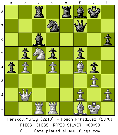 Last move : 0-1 2012 December 16 16:3:43 [Event "FICGS__CHESS__RAPID_SILVER__000099"] [Site "FICGS"] [Date "2012.10.11"] [Round "1"] [White "Perikov,Yuriy"] [Black "Wosch,Arkadiusz"] [Result "0-1"] [WhiteElo "2210"] [BlackElo "2070"] 1.d4 Nf6 2.c4 e6 3.g3 d5 4.Bg2 Be7 5.Nf3 O-O 6.O-O dxc4 7.Qc2 a6 8.Rd1 b5 9.Ng5 c6 10.b3 cxb3 11.axb3 h6 12.Ne4 Nd5 13.Bd2 a5 14.Nc5 Qb6 15.b4 a4 16.e4 Nf6 17.Bc3 Nbd7 18.Nd3 Qa7 19.Na3 Ba6 20.Bd2 Rfd8 21.Qb2 Nb6 22.Ne5 Rac8 23.Rdc1 Qb7 24.Bf4 Nfd7 25.Nf3 Re8 26.Rd1 f5 27.exf5 exf5 28.Nc2 Nd5 29.Ne3 g5 30.Be5 g4 31.Nxd5 cxd5 32.Ne1 Qc6 33.Rac1 Qe6 34.Nd3 Bb7 35.Bf4 Qf7 36.Bf1 Bf8 37.Nc5 Bc6 0-1 Catalan : Closed, 5.Nf3 Kingside Castling by player Black (move 5) Kingside Castling by player White (move 6) Player Black won this chess game. Follow this game move after move (download)Your body has to be in top condition. Your Chess deteriorates as your body does. You can't separate body from mind. (Bobby Fischer) Verschiedene, sehr schätzbare und im Laufe des Lebens nützliche Eigenschaften des Geistes können durch das Schachspiel erworben und gekräftigt werden, so dass sie zu Gewohnheiten werden, die uns nie im Stich lassen. (Benjamin Franklin) El Ajedrez es una hermosa aventura. (Bent Larsen) Même un GMI sait rarement calculer sur plus de cinq coups une attaque à sacrifices. (Rudolf Spielmann) Always two there are. No more no less. A master, and an apprentice. (Master Yoda in Star Wars ep.1)