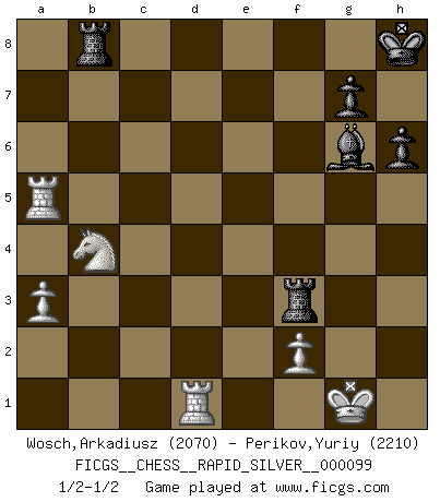 Last move : 1/2-1/2 2012 December 2 17:10:8 [Event "FICGS__CHESS__RAPID_SILVER__000099"] [Site "FICGS"] [Date "2012.10.11"] [Round "2"] [White "Wosch,Arkadiusz"] [Black "Perikov,Yuriy"] [Result "1/2-1/2"] [WhiteElo "2070"] [BlackElo "2210"] 1.e4 e5 2.Nf3 Nc6 3.Bc4 Nf6 4.d3 Bc5 5.c3 d6 6.O-O O-O 7.Bb3 a6 8.Nbd2 Ba7 9.h3 h6 10.Re1 Nh5 11.Nf1 Qf6 12.Be3 Bxe3 13.Nxe3 Nf4 14.Nd5 Nxd5 15.exd5 Ne7 16.d4 Ng6 17.dxe5 dxe5 18.Re3 Bf5 19.Qf1 Qd6 20.Rd1 f6 21.g4 Bd7 22.Nd2 Kh8 23.Ne4 Qe7 24.Qc4 f5 25.gxf5 Bxf5 26.d6 Qh4 27.Ng3 Qxh3 28.Ne2 b5 29.Qb4 a5 30.Rxh3 axb4 31.Re3 cxd6 32.Rxd6 bxc3 33.Nxc3 Rab8 34.Bd1 b4 35.Nd5 Bb1 36.a3 bxa3 37.bxa3 Nh4 38.Rxe5 Bc2 39.Rh5 Nf3+ 40.Bxf3 Rxf3 41.Nb4 Bb1 42.Rd1 Bg6 43.Ra5 1/2-1/2 Two knights defense (Modern Bishop's Opening) Kingside Castling by player White (move 6) Kingside Castling by player Black (move 6) This chess game ended in a draw. Follow this game move after move (download)The game of Chess is not merely an idle amusement; several very valuable qualities of the mind are to be acquired and strengthened by it, so as to become habits ready on all occasions; for life is a kind of Chess. (Benjamin Franklin) Das ganze Leben mit einer Ehefrau ist wie ein Endspiel mit ungleichfarbigen Läufern. (Viktor Kortschnoi) El Ajedrez por encima de todo... ¡es una pelea!. (Emanuel Lasker) Un footballeur joue avec ses pieds, parfois avec sa tête. Un joueur d'échecs ne joue qu'avec sa tête. Et quand il ne joue plus, il meurt. (Jacob Murray) Do you know these so called Volunteers don't even get paid! (Simpsons)