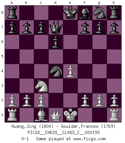 Last move : 0-1 2013 January 12 12:15:2 [Event "FICGS__CHESS__CLASS_C__000193"] [Site "FICGS"] [Date "2012.10.15"] [Round "1"] [White "Huang,Jing"] [Black "Gouldar,Frances"] [Result "0-1"] [WhiteElo "1800"] [BlackElo "1769"] 1.e4 e5 2.Nf3 Nc6 3.Bb5 d6 4.d4 exd4 5.Nxd4 Bd7 6.Nc3 Nxd4 7.Bxd7+ Qxd7 0-1 This chess game has been lost on time (started : 2012.10.15 3:33:38) Comment by player 2 : Frances Gouldar : Hello and good game ! Ruy Lopez : Old Steinitz defense Player Black won this chess game. Follow this game move after move (download)To avoid losing a piece, many a person has lost the game. (Savielly Tartakover) Ich tröste mich mit dem Vergnügen, daß Schachfans, Zuschauer und Leser glücklich sind, wenn ein Großmeister etwas riskiert, statt nur Klötzchen zu schieben. (Mikhail Nekhemyevich Tal) Un jugador que trata de regresar una movida en el Ajedrez es un futuro carterista. (Richard Fenton) Le plus grand jeu de l'esprit jamais inventé, plus vous l'apprenez, plus vous y prenez du plaisir. (Garry Kasparov) The real voyage of discovery consists not in seeking new lands but in seeing with new eyes. (Marcel Proust)