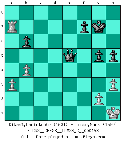 Last move : 0-1 2012 December 26 14:10:42 [Event "FICGS__CHESS__CLASS_C__000193"] [Site "FICGS"] [Date "2012.10.15"] [Round "1"] [White "Dikant,Christophe"] [Black "Josse,Mark"] [Result "0-1"] [WhiteElo "1601"] [BlackElo "1650"] 1.d4 d5 2.Nf3 c5 3.e3 Nf6 4.Nbd2 Nbd7 5.b3 g6 6.Be2 Bg7 7.Bb2 O-O 8.O-O b6 9.Ne5 Bb7 10.Ndf3 Rc8 11.c4 Ne4 12.cxd5 Nxe5 13.Nxe5 Qxd5 14.Bc4 Qd6 15.f3 Nf6 16.dxc5 Qxc5 17.Bd4 Qd6 18.Qe2 Nd5 19.f4 Nxf4 20.exf4 Qxd4+ 21.Kh1 Bxe5 22.fxe5 Bd5 23.Ba6 Rc5 24.Rac1 Rxc1 25.Rxc1 Rd8 26.h3 Kg7 27.Rc7 Qf4 28.Bd3 Qg3 29.Bc2 Ba8 30.Rxe7 Qg5 31.Rxa7 Rd2 32.Qxd2 Qxd2 33.Rxa8 Qxc2 34.Ra7 Qc1+ 35.Kh2 Qf4+ 36.Kh1 Qxe5 37.a3 h5 38.b4 g5 0-1 Queen's pawn game, Krause variation Kingside Castling by player Black (move 7) Kingside Castling by player White (move 8) Player Black won this chess game. Follow this game move after move (download)Before the endgame, the Gods have placed the middle game. (Siegbert Tarrasch) Die starken Figuren des Gegners muss man abtauschen. (José Raúl Capablanca) Robert Fischer es la ley hacia si mismo. (Larry Evans) Tout change constamment, y compris dans le monde des Echecs. (Botvinnik) Do you know these so called Volunteers don't even get paid! (Simpsons)