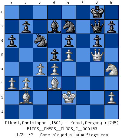 Last move : 1/2-1/2 2013 April 21 12:27:52 [Event "FICGS__CHESS__CLASS_C__000193"] [Site "FICGS"] [Date "2012.10.15"] [Round "1"] [White "Dikant,Christophe"] [Black "Kohut,Gregory"] [Result "1/2-1/2"] [WhiteElo "1601"] [BlackElo "1745"] 1.d4 Nf6 2.Nf3 e6 3.e3 d5 4.Bd3 c5 5.b3 Nc6 6.O-O Bd6 7.Bb2 O-O 8.a3 Qe7 9.Ne5 cxd4 10.exd4 Nd7 11.f4 f5 12.Nd2 Bxe5 13.fxe5 Nb6 14.Qh5 g6 15.Qh6 Qg7 16.Qh3 Bd7 17.g4 fxg4 18.Qxg4 Rae8 19.Rf3 Rxf3 20.Nxf3 Rf8 21.Rf1 Nc8 22.Qg5 N8e7 23.Nh4 Rxf1+ 24.Kxf1 a6 25.c4 Qf7+ 26.Ke2 Qg7 1/2-1/2 Queen's pawn : Yusupov-Rubinstein system Kingside Castling by player White (move 6) Kingside Castling by player Black (move 7) This chess game ended in a draw. Follow this game move after move (download)Chess is really ninety nine percent calculation. (Soltis) Das typische an einem Großmeister ist, daß er eine gewonnene Position schnell und schmerzlos gewinnt. (Irving Chernev) Alekhine es un poeta que crea un trabajo de arte de algo que raramente inspiraría a otra persona a mandar una tarjeta postal. (Max Euwe) Le moment que je préfère le plus dans une rencontre, c'est celui où je sens que la personnalité de l'adversaire se brise. (Robert Fischer) In fact if nothing is done against this teddy bear, hereby I announce that I would quit chess, rapid chess, blitz chess, postal chess, email chess, server chess and correspondence chess I will then switch to a table game where teddy bears aren't going to be seen for a while, like Poker, or Roulette, all 18+ games. (Elmer Valderrama)