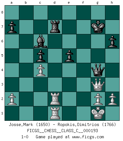 Last move : 1-0 2013 February 17 15:35:18 [Event "FICGS__CHESS__CLASS_C__000193"] [Site "FICGS"] [Date "2012.10.15"] [Round "1"] [White "Josse,Mark"] [Black "Ropokis,Dimitrios"] [Result "1-0"] [WhiteElo "1650"] [BlackElo "1766"] 1.e4 c5 2.Nc3 g6 3.d4 Bg7 4.dxc5 Bxc3+ 5.bxc3 Nf6 6.e5 Nh5 7.Bh6 Qa5 8.Qd4 Nc6 9.Qe3 f5 10.exf6 Nxf6 11.Bg7 Nd5 12.Qd2 Rg8 13.Bc4 Qxc5 14.Bxd5 Rxg7 15.Nf3 e6 16.Bxc6 bxc6 17.O-O Kf8 18.Rfe1 Kg8 19.Ne5 Rb8 20.Qf4 Qf8 21.Nf7 Ba6 22.Nh6+ Kh8 23.Qd4 c5 24.Qe5 Rb2 25.Rad1 Bb5 26.Re4 g5 27.c4 Rxc2 28.f3 Bc6 29.Rb1 Rc1+ 30.Rxc1 d6 31.Qc3 e5 32.Re2 Rg6 33.Ng4 Kg7 34.Ne3 Kg8 35.Qd3 Rf6 36.Nd5 Rf7 37.Rb1 Kg7 38.Reb2 Qc8 39.Nc3 Qe6 40.Rd1 Rd7 41.Ne4 g4 42.Rbd2 h6 43.fxg4 Qxg4 44.Nxc5 dxc5 45.Qg3 1-0 Sicilian : Closed Kingside Castling by player White (move 17) Player White won this chess game. Follow this game move after move (download)When I have White, I win because I am white; When I have Black, I win because I am Bogolyubov. (Bogolyubov) Nur ein wirklich starker Spieler weiß wie schwach er spielt. (Savielly Grigorievitsch Tartakower) El Ajedrez es parte de la cultura, y si una cultura esta en decadencia, entonces también el Ajedrez declinará. (Mikhail Botvinnik) Les Echecs sont affaire de jugement sensible. Savoir quand frapper et quand esquiver. (Fischer) Inventor: A person who makes an ingenious arrangement of wheels, levers and springs, and believes it civilization. (Ambrose Bierce, The Devil's Dictionary)