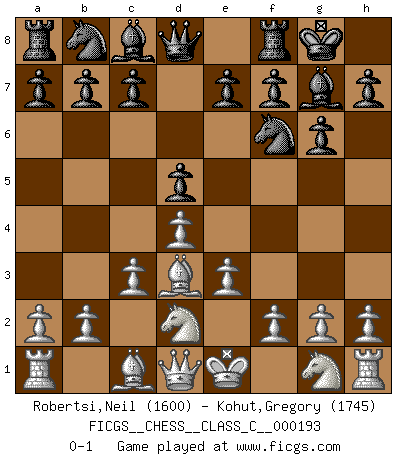 Last move : 0-1 2012 November 27 11:13:19 [Event "FICGS__CHESS__CLASS_C__000193"] [Site "FICGS"] [Date "2012.10.15"] [Round "1"] [White "Robertsi,Neil"] [Black "Kohut,Gregory"] [Result "0-1"] [WhiteElo "1600"] [BlackElo "1745"] 1.d4 Nf6 2.e3 g6 3.Bd3 Bg7 4.Nd2 O-O 5.c3 d5 0-1 This chess game has been lost on time (started : 2012.10.15 3:33:38) Queen's pawn game Kingside Castling by player Black (move 4) Player Black won this chess game. Follow this game move after move (download)He who takes the Queen's Knight's Pawn will sleep in the streets. (Anonymous) Du weisst es gibt ein Problem mit Computern und Fernschach, wenn jeder eine Rating von 2450 hat. (John Christen Knudsen) Es muy difícil jugar en contra de la teoría de Einstein. - en su primera derrota en contra de Fischer (Mikhail Tal) Je ne crois pas en la psychologie, je crois aux bons coups. (Robert Fischer) Being number two sucks. (Andre Agassi)