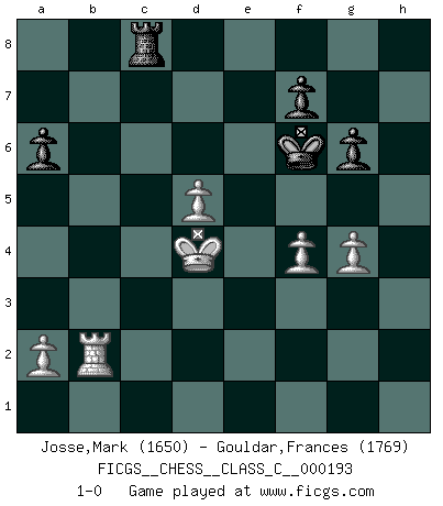 Last move : 1-0 2013 March 14 12:27:21 [Event "FICGS__CHESS__CLASS_C__000193"] [Site "FICGS"] [Date "2012.10.15"] [Round "1"] [White "Josse,Mark"] [Black "Gouldar,Frances"] [Result "1-0"] [WhiteElo "1650"] [BlackElo "1769"] 1.e4 c5 2.Nc3 d6 3.f4 Nc6 4.Nf3 Nf6 5.Bc4 Bg4 6.h3 Bxf3 7.Qxf3 Nd4 8.Qd1 e6 9.O-O a6 10.d3 d5 11.exd5 Nxd5 12.Bxd5 exd5 13.Qh5 Be7 14.Nxd5 Nxc2 15.Bd2 O-O 16.Rac1 Nb4 17.Bxb4 cxb4 18.Rc7 Bf6 19.Rxb7 Bxb2 20.Rxb4 Rb8 21.Rxb8 Qxb8 22.Ne7+ Kh8 23.Qc5 Rd8 24.Nc6 Qd6 25.Qxd6 Rxd6 26.Rb1 Rxc6 27.Rxb2 g6 28.Kf2 Kg7 29.Ke3 Re6+ 30.Kd4 Rd6+ 31.Kc4 h5 32.d4 Kf6 33.d5 Rd8 34.g4 hxg4 35.hxg4 Rc8+ 36.Kd4 1-0 Comment by player 2 : Frances Gouldar : Hello and good game ! Sicilian : Closed Kingside Castling by player White (move 9) Kingside Castling by player Black (move 15) Player White won this chess game. Follow this game move after move (download)Later, I began to succeed in decisive games. Perhaps because I realized a very simple truth: not only was I worried, but also my opponent. (Mikhail Tal) Im Spitzenschach von heute geht es nur um Vorbereitung, um tiefgründige, sorgfältige Eröffnungsvorbereitung. (Nigel Short) En la vida, como en el Ajedrez, los Peones propios obstruyen nuestro camino. La gran fortuna de un hombre, su comodidad, placer, hijos, libros, que deberían ayudarle a ganar, con mucha frecuencia lo ponen en Jaque Mate. (Charles Buxton) Un millionnaire : 'Monsieur Steinitz ! Vous ne participez aux tournois que pour l'argent, alors que moi je n'y viens que pour l'honneur.' Steinitz : 'Chacun joue pour ce qu'il n'a pas'... It's not a bug - it's an undocumented feature. (Anonymous)