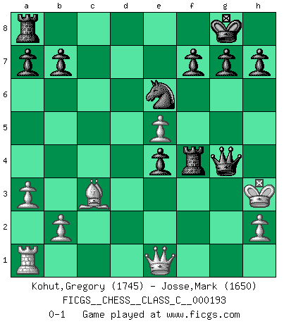 Last move : 0-1 2013 March 6 22:7:27 [Event "FICGS__CHESS__CLASS_C__000193"] [Site "FICGS"] [Date "2012.10.15"] [Round "1"] [White "Kohut,Gregory"] [Black "Josse,Mark"] [Result "0-1"] [WhiteElo "1745"] [BlackElo "1650"] 1.d4 Nf6 2.c4 e6 3.Nc3 Bb4 4.f3 O-O 5.e4 d5 6.e5 Nfd7 7.cxd5 exd5 8.f4 c5 9.a3 Ba5 10.Be3 cxd4 11.Bxd4 Nc6 12.Nf3 Bxc3+ 13.Bxc3 Nc5 14.Be2 Bf5 15.O-O Ne6 16.Nd4 Qb6 17.g4 Be4 18.Bf3 Ncxd4 19.Bxe4 dxe4 20.Kg2 Nf3 21.Kg3 Rfd8 22.Qe2 Rd3 23.Rxf3 Rxf3+ 24.Kh4 Qd8+ 25.g5 Rxf4+ 26.Kh3 Qxg5 27.Qe1 Qg4+ 0-1 Nimzo-Indian : Kmoch variation Kingside Castling by player Black (move 4) Kingside Castling by player White (move 15) Player Black won this chess game. Follow this game move after move (download)No price is too great for the scalp of the enemy King. (Koblentz) Fallen sollten polizeilich verboten werden. (Savielly Grigorievitsch Tartakower) En partidas rápidas, el Caballo es mas poderoso que el Alfil. (Vlastimil Hort) Le jeu d'échecs fait naître et fortifie en nous plusieurs qualités précieuses dans le cours de l'existence, telles que la prévoyance, la circonspection, la prudence, et la persévérance. (Benjamin Franklin - 1783, la morale des échecs) When you stop learning you start dying. (Scott Adams)
