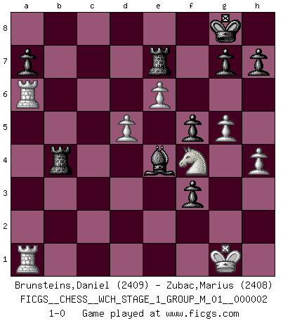 Last move : 1-0 2007 May 6 15:49:7 [Event "FICGS__CHESS__WCH_STAGE_1_GROUP_M_01__000002"] [Site "FICGS"] [Date "2007.01.16"] [Round "1"] [White "Brunsteins,Daniel"] [Black "Zubac,Marius"] [Result "1-0"] [WhiteElo "2409"] [BlackElo "2408"] 1.d4 d5 2.c4 e6 3.Nf3 c6 4.Nc3 Nf6 5.e3 Nbd7 6.Qc2 Bd6 7.g4 Bb4 8.Bd2 Qe7 9.g5 Bxc3 10.Bxc3 Ne4 11.h4 b6 12.Bd3 Nxc3 13.Qxc3 dxc4 14.Be4 O-O 15.Bxc6 Rb8 16.Qxc4 b5 17.Qc2 Ba6 18.Bxd7 Qxd7 19.Ne5 Qe7 20.Qc5 Qb7 21.Qc6 Rbc8 22.Qxb7 Bxb7 23.O-O f6 24.Nd7 Rf7 25.Nc5 Bd5 26.f4 e5 27.b4 Bc4 28.Rfd1 exf4 29.e4 f5 30.e5 Bd5 31.a4 bxa4 32.Rxa4 Rb8 33.Rda1 Re7 34.Nd3 f3 35.Nf4 Bc6 36.Ra6 Be4 37.e6 Rxb4 38.d5 1-0 Queen's gambit declined Kingside Castling by player Black (move 14) Kingside Castling by player White (move 23) Player White won this chess game. Follow this game move after move (download)I like the moment when I break a man's ego. (Bobby Fischer) Unter Putin wird alles Geld aus Russland wie von einem Staubsauger nach Moskau umgeleitet, das ist wie ein schwarzes Loch. (Garry Kasparov) Si un gobernante no entiende al Ajedrez, ¿como puede governar él un reinado?. (El Rey Khusros II) J'apprécie les joueurs d'est-indienne, c'est grâce à eux que je nourris ma famille depuis tant d'années. (Petrosian) I just play for fun. (Anna Kournikova)