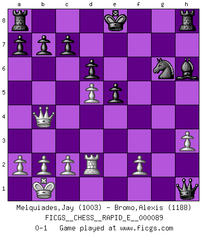 Last move : 0-1 2012 October 16 19:41:50 [Event "FICGS__CHESS__RAPID_E__000089"] [Site "FICGS"] [Date "2012.10.15"] [Round "1"] [White "Melquiades,Jay"] [Black "Bromo,Alexis"] [Result "0-1"] [WhiteElo "1003"] [BlackElo "1188"] 1.e4 e5 2.Nf3 Nc6 3.d4 d6 4.Bb5 Bd7 5.d5 Nce7 6.Bxd7+ Qxd7 7.Nc3 Nf6 8.h3 h6 9.g4 g5 10.Bxg5 hxg5 11.Qd2 Bh6 12.O-O-O Ng6 13.Ne2 Nxe4 14.Qe1 f5 15.gxf5 Qxf5 16.Neg1 g4 17.Kb1 gxf3 18.Nxf3 Qxf3 19.Qb4 Nd2+ 20.Rxd2 Qxh1+ 0-1 Scotch Opening Queenside Castling by player White (move 12) Player Black won this chess game. Follow this game move after move (download)A bad plan is better than none at all. (Frank Marshall) Schach ist wie eine schöne Frau, zu der wir ständig zurückkehren, gleichviel, wie oft sie uns zurückweist. (Anonymous) Un juego de Ajedrez es un dialogo, una conversación entre un jugador y su oponente. Cada movimiento del oponente puede contener amenazas o tropiezos, pero un jugador no se puede defender de las amenazas o tomar ventaja de los tropiezos si es que no se pregunta a sí mismo: ¿Que es lo que mi oponente va a hacer después de cada movida?. (Bruce A. Moon) C'est la seule position que je connaisse où les deux camps sont mals. Propos prêtés à V. Anand. Success without honor is an unseasoned dish; it will satisfy your hunger, but it won't taste good. (Joe Paterno)