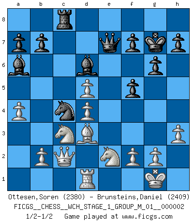 Last move : 1/2-1/2 2007 March 23 23:50:0 [Event "FICGS__CHESS__WCH_STAGE_1_GROUP_M_01__000002"] [Site "FICGS"] [Date "2007.01.16"] [Round "1"] [White "Ottesen,Soren"] [Black "Brunsteins,Daniel"] [Result "1/2-1/2"] [WhiteElo "2380"] [BlackElo "2409"] 1.e4 c6 2.d4 d5 3.exd5 cxd5 4.c4 Nf6 5.Nc3 g6 6.Qb3 Bg7 7.cxd5 O-O 8.Be2 Nbd7 9.Bf3 Nb6 10.Nge2 Bf5 11.O-O Qd7 12.Re1 Rac8 13.h3 Rfd8 14.Ng3 Bd3 15.Qa3 Re8 16.Bg5 Ba6 17.Bxf6 exf6 18.Rxe8+ Qxe8 19.Be2 Nc4 20.Qb4 Bf8 21.Qb3 f5 22.Bd3 Bd6 23.Nge2 Qe7 24.Rc1 Na5 25.Qc2 Nc4 26.a4 Kg7 27.Rd1 1/2-1/2 Caro-Kann : Panov-Botvinnik attack, 5...g6 Kingside Castling by player Black (move 7) Kingside Castling by player White (move 11) This chess game ended in a draw. Follow this game move after move (download)What is the difference between chess and football? Everybody understands football, but nobody plays it. Everybody plays chess, but nobody understands it. Everything is relative. (Vladimir Kramnik) Der Vorposten provoziert a) eine Basis für neue Angriffe und b) eine Schwächung der gegnerischen Widerstandskraft in der fraglichen Linie. (Aaron Nimzowitsch) Hay dos clases de hombres: aquellos que se conforman en dejarse llevar por las circunstancias y que juegan barajas y aquellos decididos a controlar las circunstancias y que juegan al Ajedrez. (Mortimer Collins) Aidez vos pièces, elles vous aideront. (Paul Morphy) Even the best needles are not sharp at both ends. (Chinese proverb)