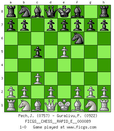 Last move : 1-0 2012 November 21 10:58:15 [Event "FICGS__CHESS__RAPID_E__000089"] [Site "FICGS"] [Date "2012.10.15"] [Round "1"] [White "Pech,Jaroslav"] [Black "Guralivu,Paul-Iosif"] [Result "1-0"] [WhiteElo "0757"] [BlackElo "0922"] 1.e4 c5 2.c3 Nf6 3.e5 1-0 This chess game has been lost on time (started : 2012.10.15 18:5:10) Sicilian : Alapin's variation (2.c3) Player White won this chess game. Follow this game move after move (download)I have never in my life played the French Defence, which is the dullest of all openings. (Wilhelm Steinitz) Kasparov ist eine Art Monster mit hundert Augen, denen auch nicht das Geringste entgeht. (Tony Miles) Durante una competencia de Ajedrez, un Maestro de Ajedrez deberá ser una combinación de presa de caza y un Monge. (Alexander Alekhine) J'ai vu le vaincu d'Echecs jouer des années durant dans l'espoir de la fête de la victoire. Car tu es plus riche de ce qu'elle existe si même elle n'est point pour toi. Ainsi de la perle du fond des mers. (Antoine de Saint-Exupéry) There are 10 types of people in this world: those who understand binary and those who don't. (Anonymous)