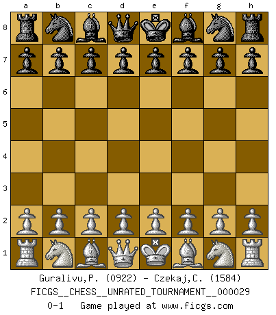 Last move : 0-1 2012 November 27 23:12:38 [Event "FICGS__CHESS__UNRATED_TOURNAMENT__000029"] [Site "FICGS"] [Date "2012.10.18"] [Round "1"] [White "Guralivu,Paul-Iosif"] [Black "Czekaj,Christophe"] [Result "0-1"] [WhiteElo "0922"] [BlackElo "1584"] 0-1 This chess game has been lost on time (started : 2012.10.18 20:54:20) Player Black won this chess game. Follow this game move after move (download)Chess is above all, a fight ! (Emanuel Lasker) Immer nach dem besten Zug zu suchen ist ziemlich unpraktisch. (Nigel Short) El Ajedrez es un invernadero donde los frutos del carácter pueden madurar mas completamente que en la vida. (Edward Morgan Foster) Seul un grand joueur sait à quel point il joue faiblement. (Xavier Tartacover) First of all, we have to go back to the classical time control. (Anatoly Karpov)