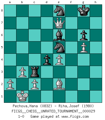 Last move : 1-0 2013 May 31 16:36:35 [Event "FICGS__CHESS__UNRATED_TOURNAMENT__000029"] [Site "FICGS"] [Date "2012.10.18"] [Round "1"] [White "Pechova,Hana"] [Black "Riha,Josef"] [Result "1-0"] [WhiteElo "0832"] [BlackElo "1980"] 1.e4 c5 2.Nf3 d6 3.d4 cxd4 4.Nxd4 Nf6 5.Nc3 a6 6.Be3 e5 7.Nb3 Be7 8.f3 Be6 9.Qd2 O-O 10.O-O-O Nbd7 11.g4 b5 12.g5 b4 13.Ne2 Ne8 14.Ng3 a5 15.Kb1 f6 16.h4 a4 17.Nc1 fxg5 18.hxg5 Rxf3 19.Nf5 a3 20.b3 Nc7 21.Be2 Rxe3 22.Nxe7+ Qxe7 23.Qxe3 d5 24.Rh4 d4 25.Qg3 Rb8 26.Rdh1 g6 27.Rxh7 Qxh7 28.Rxh7 Kxh7 29.Nd3 Rb5 30.Qe1 Kg7 31.Nxb4 Rc5 32.Qc1 Rc3 33.Qxa3 Kg8 34.Nd3 Ne8 35.Nxe5 Nxe5 36.Qe7 1-0 Sicilian : Najdorf, Byrne (English) attack Kingside Castling by player Black (move 9) Queenside Castling by player White (move 10) Player White won this chess game. Follow this game move after move (download)I believe that Chess possesses a magic that is also a help in advanced age. A rheumatic knee is forgotten during a game of Chess and other events can seem quite unimportant in comparison with a catastrophe on the chessboard. (Vlastimil Hort) Frage: Gibt es etwas was Sie mehr lieben als Autobahnen ohne Tempobegrenzungen? - Antwort: Deutsche Frauen ohne Tempobegrenzungen. (Loek van Wely) Jugadores de primera clase pierden en contra de jugadores de segunda clase porque los jugadores de segunda clase a veces juegan una partida de primer clase. (Siegbert Tarrasch) 'L'échange des dames est un coup dur pour les deux adversaires...' Un journaliste lors d'une partie du match Spassky-Fischer Children in the dark cause accidents, accidents in the dark cause children. (Unknown)