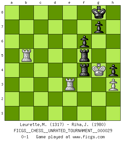 Last move : 0-1 2012 November 21 21:17:26 [Event "FICGS__CHESS__UNRATED_TOURNAMENT__000029"] [Site "FICGS"] [Date "2012.10.18"] [Round "1"] [White "Leurette,Marc-Antoine"] [Black "Riha,Josef"] [Result "0-1"] [WhiteElo "1317"] [BlackElo "1980"] 1.e4 c5 2.Nc3 Nc6 3.Nf3 e6 4.d4 cxd4 5.Nxd4 a6 6.Be3 Qc7 7.Qd3 Ne5 8.Qd2 Bb4 9.Bd3 Ne7 10.O-O Bxc3 11.Qxc3 Qxc3 12.bxc3 O-O 13.a4 d5 14.exd5 Nxd5 15.Bd2 Nxd3 16.cxd3 e5 17.Nf3 f6 18.c4 Ne7 19.Bc3 Bg4 20.d4 Bxf3 21.gxf3 exd4 22.Bxd4 Nc6 23.Bc5 Rfc8 24.Bb6 Ne5 25.c5 Nxf3+ 26.Kg2 Nd2 27.Rfe1 Nb3 28.Rad1 Nxc5 29.Bxc5 Rxc5 30.Rd7 b5 31.axb5 axb5 32.R1e7 Rg5+ 33.Kf3 h5 34.h3 Ra3+ 35.Re3 Ra2 36.Rb7 Rf5+ 37.Kg3 Raxf2 38.Rxb5 h4+ 39.Kg4 R2f4+ 0-1 Sicilian : Closed, 2...Nc6 Kingside Castling by player White (move 10) Kingside Castling by player Black (move 12) 10 pieces endgame at move 38 : White KRRP , Black KRRPPP WHITE : King + 2 Rooks 1 Pawn BLACK : King + 2 Rooks 3 Pawns Player Black won this chess game. Follow this game move after move (download)Chess is as much a mystery as women. (Purdy) Eine Person mit durchschnittlichem IQ kann etwa eine ELO von 2000 erreichen. (Jonathan Levitt) En un gambito tu regalas un Peón por el bién de tomar un juego perdido. (Samuel Standige Boden) Pour moi, les échecs ne sont pas un jeu mais un art. (Alexandre Alekhine) He who fights with monsters should be careful lest he thereby become a monster. (Friedrich Nietzsche, Beyond Good and Evil)