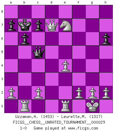 Last move : 1-0 2012 December 6 20:39:2 [Event "FICGS__CHESS__UNRATED_TOURNAMENT__000029"] [Site "FICGS"] [Date "2012.10.18"] [Round "1"] [White "Uzzaman,Ashik"] [Black "Leurette,Marc-Antoine"] [Result "1-0"] [WhiteElo "1453"] [BlackElo "1317"] 1.e4 e5 2.Nf3 Nc6 3.d4 exd4 4.Bc4 Qe7 5.O-O Nf6 6.Bg5 h6 7.Bh4 Ne5 8.Bb3 b6 9.Re1 Bb7 10.Nxd4 O-O-O 11.Nf5 Qc5 12.Nc3 Re8 13.Bxf6 gxf6 14.Qh5 Ng6 15.Bxf7 Re5 16.Qxg6 Qc6 17.Bd5 Qc5 18.Qxf6 Rh7 19.Qxe5 Bxd5 20.Nxd5 Bd6 21.Qe8+ Kb7 22.Qg8 Be5 23.Qxh7 Bxb2 24.Rab1 Bd4 25.Nxd4 Qxd4 26.Qxd7 Qc5 27.Ne7 1-0 Scotch gambit Kingside Castling by player White (move 5) Queenside Castling by player Black (move 10) Player White won this chess game. Follow this game move after move (download)You have to have the fighting spirit. You have to force moves and take chances. (Bobby Fischer) Der zweitbeste Zug ist oft der einzig richtige. (Savielly Grigorievitsch Tartakower) El Ajedrez te enseña a controlarl la excitación inicial que sientes cuando vez algo que parece bueno y te enseña a pensar objetivamente cuando te encuentras en problemas. (Stanley Kubrick) Karpov est une pièce de musée. (Garry Kasparov) Everything in life is luck. (Donald Trump)