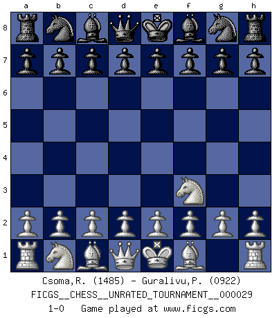 Last move : 1-0 2012 November 27 23:12:38 [Event "FICGS__CHESS__UNRATED_TOURNAMENT__000029"] [Site "FICGS"] [Date "2012.10.18"] [Round "1"] [White "Csoma,Robert"] [Black "Guralivu,Paul-Iosif"] [Result "1-0"] [WhiteElo "1485"] [BlackElo "0922"] 1.Nf3 1-0 This chess game has been lost on time (started : 2012.10.18 20:54:20) Reti Opening Player White won this chess game. Follow this game move after move (download)We like to think. (Gary Kasparov) Schach ist das Spiel, das die Verrückten gesund hält. (Albert Einstein) Juega la Apertura como un libro, el Juego Medio como un mago y los Finales como una máquina. (Spielmann) Il n'y a pas eu de défaite parce que je ne crois pas que cet ordinateur ait jamais existé. IBM a triché en refusant d'imprimer les modes de recherche de la machine. C'est évident, pendant le match, des coups décisifs ont été joués par des êtres humains. Aujourd'hui, les meilleurs spécialistes en informatique ne peuvent toujours pas expliquer comment Deep-Blue a pu jouer contre la logique des ordinateurs. IBM a gagné une guerre de communication, mais ils sont incapables de prouver que l'ordinateur a gagné tout seul. (Garry Kasparov) Thibault, I ask for draw. Game 13876. - Sorry Ilmars, you won. (FICGS chat)
