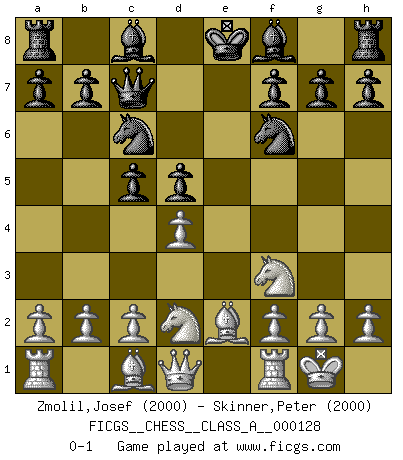 Last move : 0-1 2012 December 2 23:28:21 [Event "FICGS__CHESS__CLASS_A__000128"] [Site "FICGS"] [Date "2012.10.20"] [Round "1"] [White "Zmolil,Josef"] [Black "Skinner,Peter"] [Result "0-1"] [WhiteElo "2000"] [BlackElo "2000"] 1.e4 e6 2.d4 d5 3.Nd2 c5 4.exd5 exd5 5.Ngf3 Nc6 6.Bb5 Qe7+ 7.Be2 Qc7 8.O-O Nf6 0-1 This chess game has been lost on time (started : 2012.10.20 11:59:24) French : Tarrasch, Open variation, Main line Kingside Castling by player White (move 8) Player Black won this chess game. Follow this game move after move (download)In Fischer's hands, a slight theoretical advantage is as good a being a Queen ahead. (Isaac Kashdan) Kasparov stellt für gewöhnlich die Regeln auf und bricht sie dann selbst wieder. (Alexej Shirov) Al jugar al Ajedrez entonces, podemos aprender: Primero: Previsión... Segundo: Prudencia... Tercero: Cautela... Y al final, aprendemos del Ajedrez el hábito de no ser desanimados por apariencias malas presentes en el estado de nuestros asuntos, el hábito de la esperanza por una oportunidad favorable y la perseveración de los secretos de los recursos. (Benjamin Franklin) Le temps de noter son nom sur la feuille de partie, j'étais déjà en zeitnot ! D'un modeste amateur apparié lors de la première ronde d'un open contre le grand-maître Azmaïparashvili. Hardware: the parts of a computer that can be kicked. (Jeff Persis)