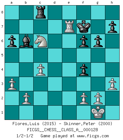 Last move : 1/2-1/2 2012 December 6 10:37:42 [Event "FICGS__CHESS__CLASS_A__000128"] [Site "FICGS"] [Date "2012.10.20"] [Round "1"] [White "Flores,Luis"] [Black "Skinner,Peter"] [Result "1/2-1/2"] [WhiteElo "2015"] [BlackElo "2000"] 1.e4 c5 2.Nf3 Nc6 3.Bb5 e6 4.O-O Nge7 5.Re1 a6 6.Bf1 d5 7.exd5 Nxd5 8.d4 Nf6 9.dxc5 Qxd1 10.Rxd1 Bxc5 11.Nc3 e5 12.Re1 O-O 13.Bd3 Re8 14.h3 Nd4 15.Nxd4 Bxd4 16.Ne2 Bb6 17.Ng3 Nd5 18.a3 Bd7 19.Be4 Bc6 20.Bg5 f6 21.c4 Nf4 22.Bxc6 bxc6 23.Bxf4 exf4 24.Nf5 g6 25.Ne7+ Kf7 26.Nxc6 Rxe1+ 27.Rxe1 Rc8 28.Re7+ Kg8 29.Re6 Kf7 30.Re7+ Kg8 31.Re6 Kf7 32.Re7+ 1/2-1/2 Sicilian : Nimzovich-Rossolimo attack (without ...d6) Kingside Castling by player White (move 4) Kingside Castling by player Black (move 12) This chess game ended in a draw. Follow this game move after move (download)A man without frontiers. He didn't divide the East and the West, he brought them together in their admiration for him. (Ljubomir Ljubojevic, about Bobby Fischer's death) Ja, ich habe einmal eine Blitzpartie gespielt, es war in einem Zug, 1929. --im Interview 1989 (Mikhail Moiseyevich Botvinik) La estratégia requiere pensar, la táctica requiere observación. (Max Euwe) J'ai toujours senti une vague pitié pour l'homme qui ne connaît rien aux échecs, tout comme j'en aurais pour un homme ignorant de l'amour. Les Echecs, comme la musique ou comme l'amour, ont le pouvoir de rendre heureux. (Siegbert Tarrasch) They say in chess you've got to kill the queen, and then you mate it... Oh I, do you ? (Red Hot Chili Peppers, Fortune faded)