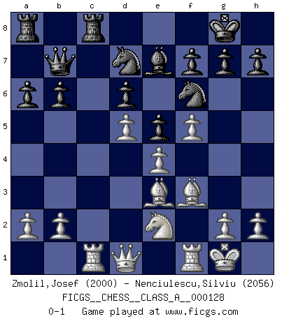 Last move : 0-1 2013 March 22 1:39:48 [Event "FICGS__CHESS__CLASS_A__000128"] [Site "FICGS"] [Date "2012.10.20"] [Round "1"] [White "Zmolil,Josef"] [Black "Nenciulescu,Silviu"] [Result "0-1"] [WhiteElo "2000"] [BlackElo "2056"] 1.c4 Nf6 2.Nc3 e6 3.Nf3 c5 4.d4 cxd4 5.Nxd4 a6 6.e4 d6 7.Be2 Be7 8.O-O O-O 9.Be3 Qc7 10.Rc1 Nbd7 11.f4 b6 12.Bf3 Bb7 13.f5 e5 14.Nde2 Rfc8 15.Nd5 Bxd5 16.cxd5 Qb7 0-1 This chess game has been lost on time (started : 2012.10.20 11:59:24) English Opening Kingside Castling by player White (move 8) Kingside Castling by player Black (move 8) Player Black won this chess game. Follow this game move after move (download)Chess teaches you to control the initial excitement you feel when you see something that looks good and it trains you to think objectively when you're in trouble. (Stanley Kubrick) Ohne ihre Erfolge schmälern zu wollen würde ich sagen Petrosian, Spassky und Karpov verdanken ihre Siege ihren Trainern - Boleslavsky, Bondarevsky und Furman. (Mikhail Moiseyevich Botvinik) Tu cuerpo tiene que estar en óptima condición. Tu Ajedrez se deteriora como lo hace tu cuerpo. No puedes separar la mente y el cuerpo. (Bobby Fischer) Aucun coup ne doit être joué sans but. (Pedro Damiano) The hypothalamus is one of the most important parts of the brain, involved in many kinds of motivation, among other functions. The hypothalamus controls the 'Four Fs: Fighting, Fleeing, Feeding and Mating. (Unknown author)