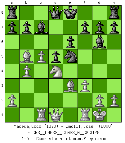 Last move : 1-0 2013 May 18 22:54:21 [Event "FICGS__CHESS__CLASS_A__000128"] [Site "FICGS"] [Date "2012.10.20"] [Round "1"] [White "Maceda,Coco"] [Black "Zmolil,Josef"] [Result "1-0"] [WhiteElo "1879"] [BlackElo "2000"] 1.e4 c6 2.d4 d5 3.e5 Bf5 4.Nf3 e6 5.Be2 c5 6.Be3 cxd4 7.Nxd4 Ne7 8.Nd2 Nbc6 9.N2f3 Bg6 10.O-O Nf5 11.Nxf5 Bxf5 12.Nd4 Be4 13.Rc1 Nxe5 14.f3 Bg6 15.c4 Bc5 16.b4 Bb6 17.c5 Bc7 18.Bb5+ 1-0 This chess game has been lost on time (started : 2012.10.20 11:59:24) Caro-Kann : Advance variation Kingside Castling by player White (move 10) Player White won this chess game. Follow this game move after move (download)You cannot play at Chess if you are kind-hearted. (French Proverb) Ich liebe den Moment, wenn ich das Ego meines Gegenüber breche. (Robert James Fischer) Si no le temes a Spassky, entonces elimino el elemento del dinero. (Jim Slater) Echiquier : carré parfait, comme la Jérusalem nouvelle décrite par l'auteur de l'Apocalypse, huit cases sur huit, exaltation du chiffre 4, symbole du cosmos aux quatre horizons... où le noir et le blanc, l'ombre et la lumière, le mal et le bien s'entremêlent et se conjuguent. (Robert Couffignal, Le Gambit du poète) Pushing plastic is for the many, pushing virtual pieces is for the fewer, pushing wood is for the very few. (Normajean Yates)